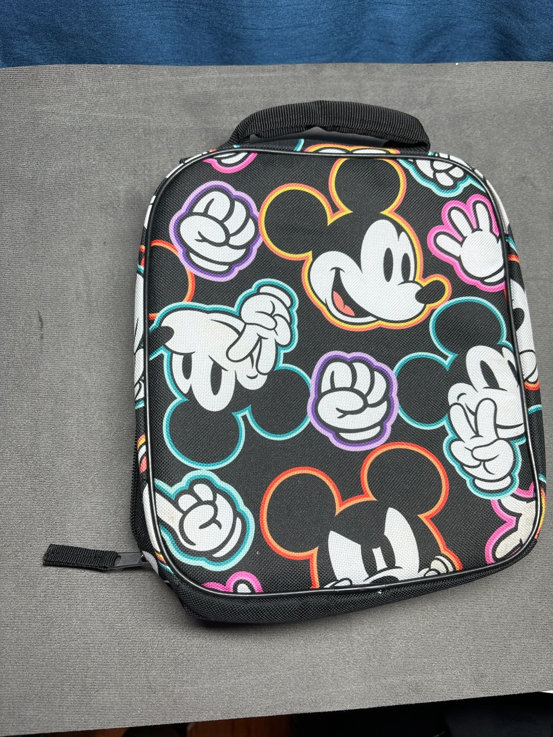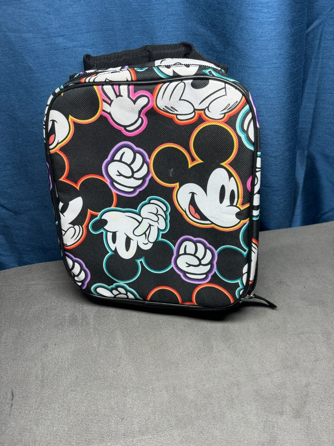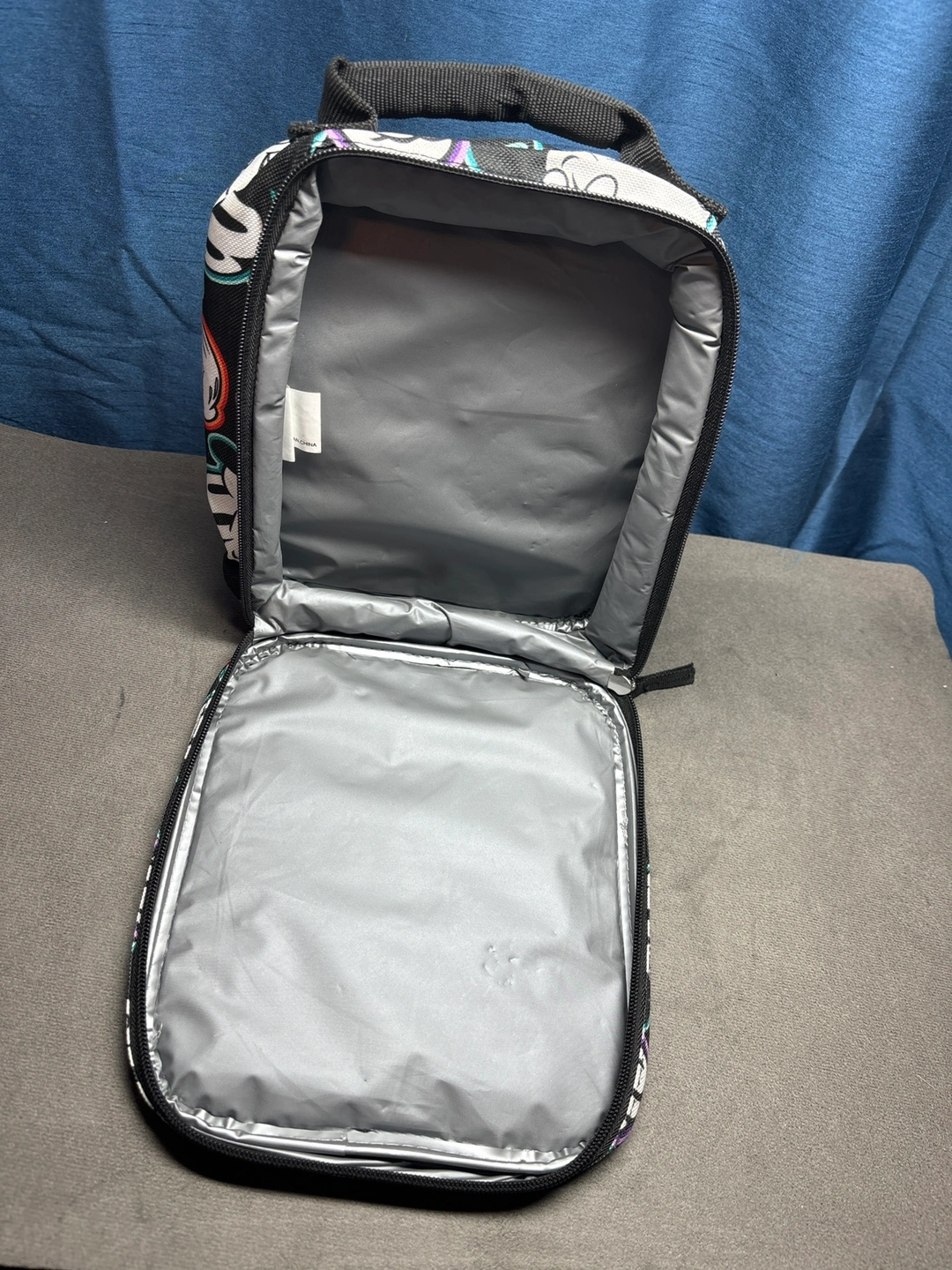 Lunch bag featuring Mickey Mouse. Has a zipper closure and an insulated interior. Features a handle. Perfect for kids or adults.