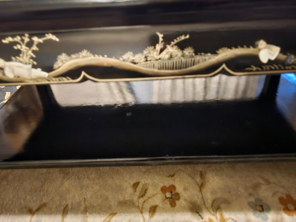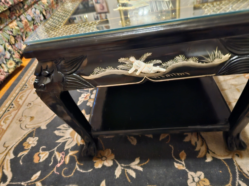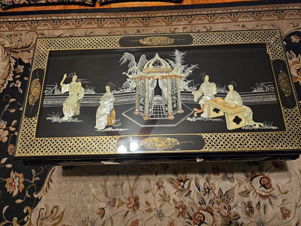 90Vintage Asian black lacquer & Mother of Pearl glass-top coffee table with inlay / NYC pickup only / located in Kensington, Brooklyn / Gorgeous! This vintage coffee table boasts an exquisite design with black lacquer and Mother of Pearl inlay. The table's primary material is high-quality wood, making it a sturdy and reliable piece of furniture. It showcases a beautiful black color that complements any room and is perfect for those seeking an antique original piece. The table's unique features make it an excellent addition to anyone's Asian furniture collection. Whether you're using it as a functional coffee table or simply as a decorative piece, this vintage Asian black lacquer & Mother of Pearl inlay table is sure to impress. Has a high-quality glass top that protects the beautiful art display on top, which has pretty Geisha girls. Sides feature raised figurines. Wonderful gilt inlay and design. Gorgeous hand-painted details. Table measurements: 41" (length) x 21" (width) x 18" (height). See my other listings by visiting my Ebay store, theevictorianrose. More interesting listings also at: mvdandfriends1313.