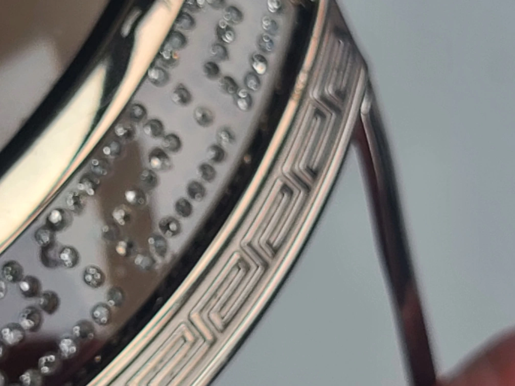 These are a pair of Versace sunglasses in a gold metal frame with brown lenses. They have a decorative, Greek key pattern on the frame. They are in a red case.