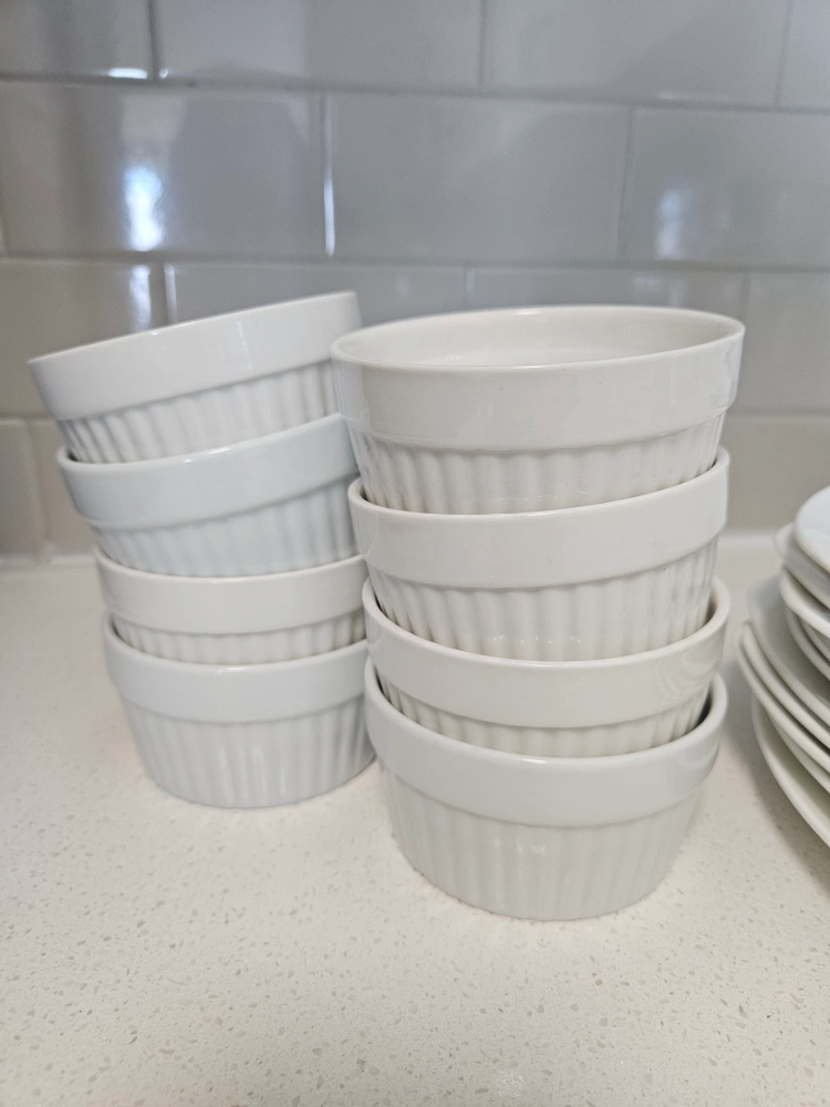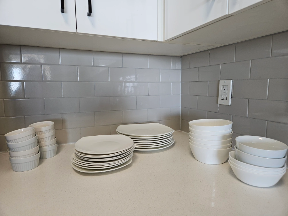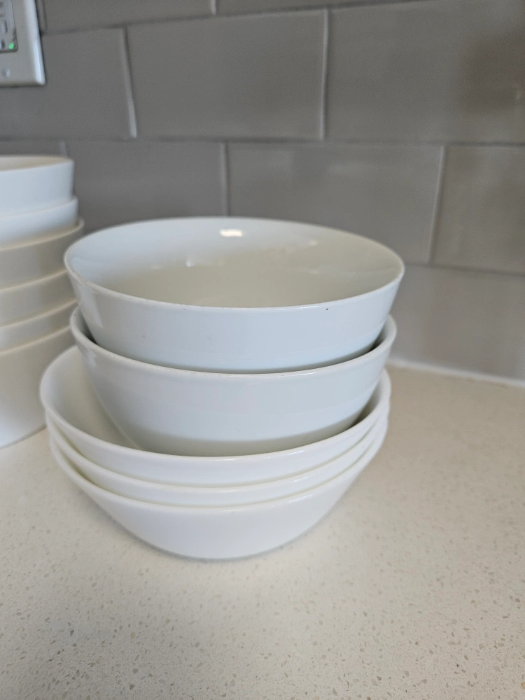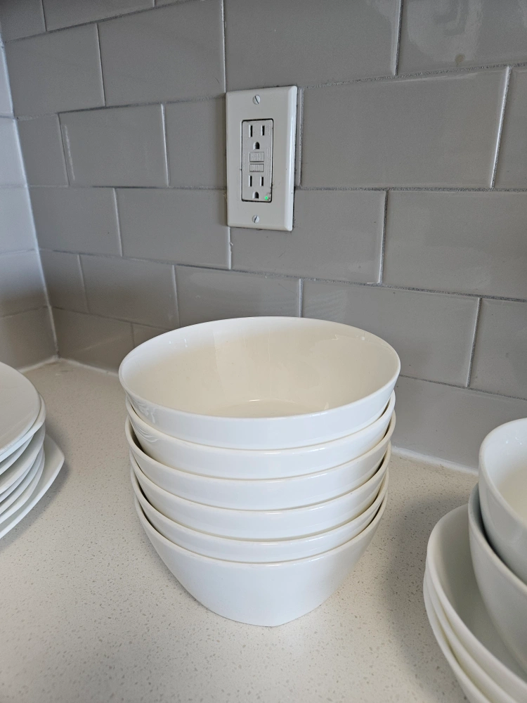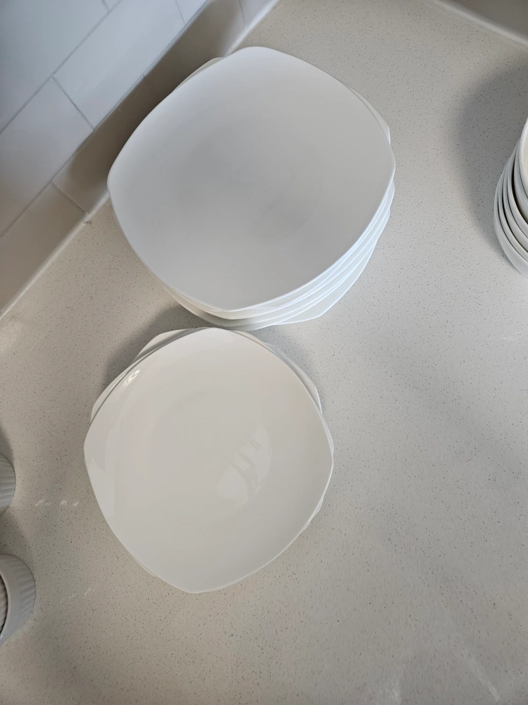 Set includes dinner plates, salad plates, bowls, and soup bowls.