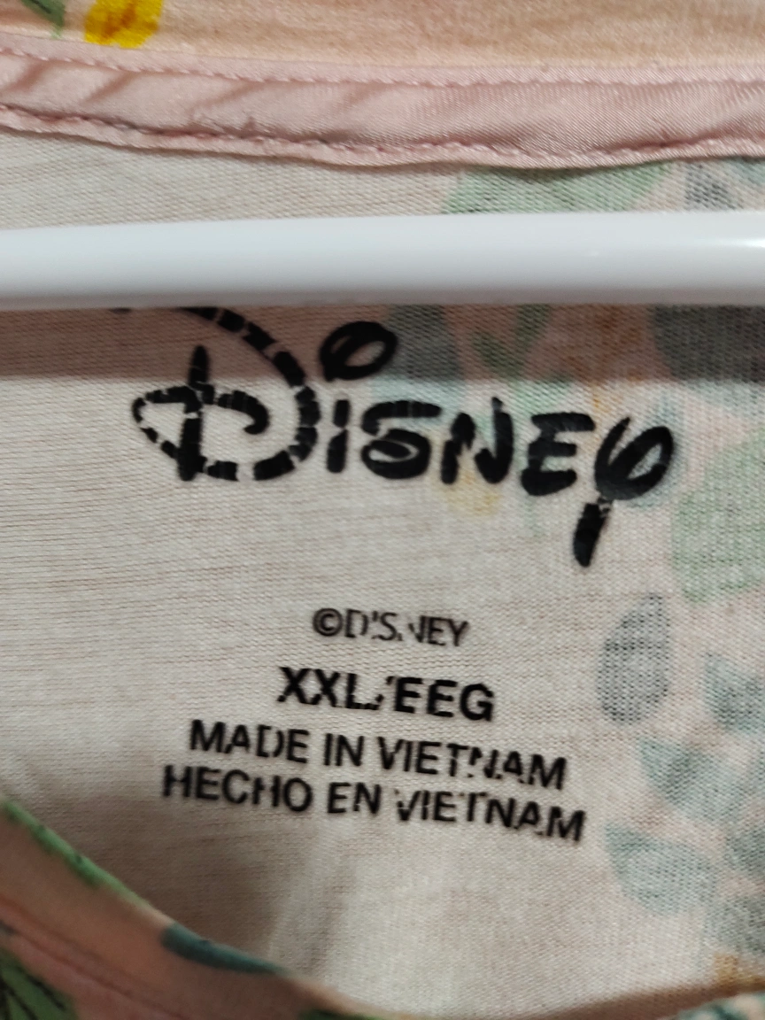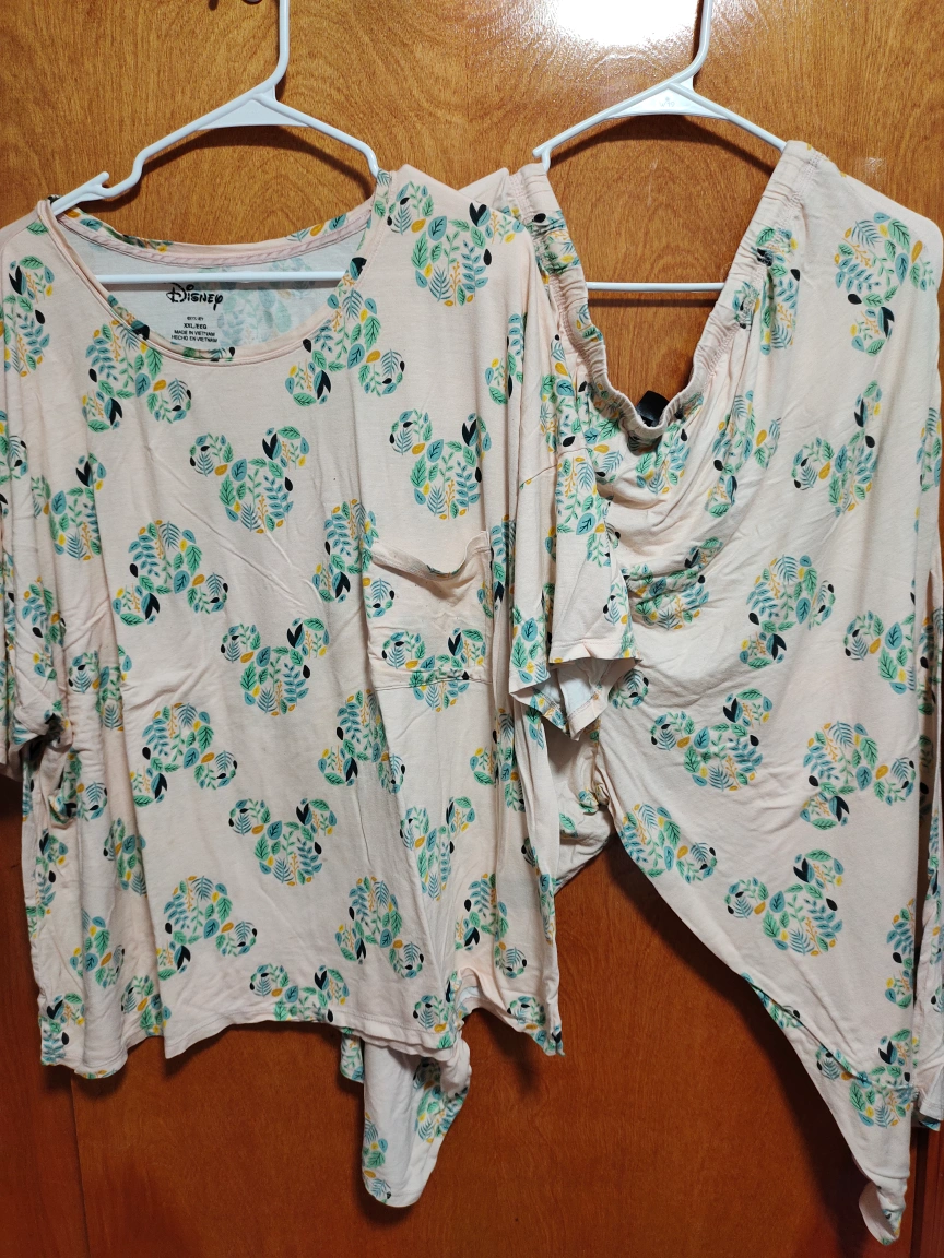 Women's pajama set. The top has a Mickey Mouse head outline design and a pocket. The pants are loose fitting. The set is in a peach color with a green and yellow pattern. The size is XXL/EEG. #freecycle