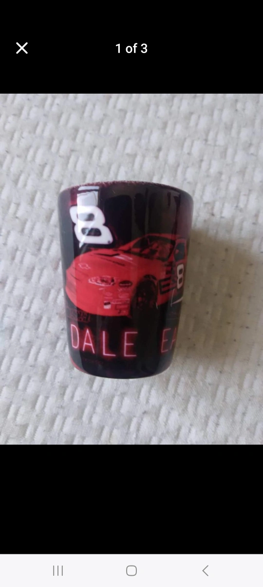 This shot glass is a black and red design featuring a picture of Dale Earnhardt Jr.'s race car. The number 8 is prominent on the car and glass. The glass has the words "Dale Earnhardt Jr." on the bottom.