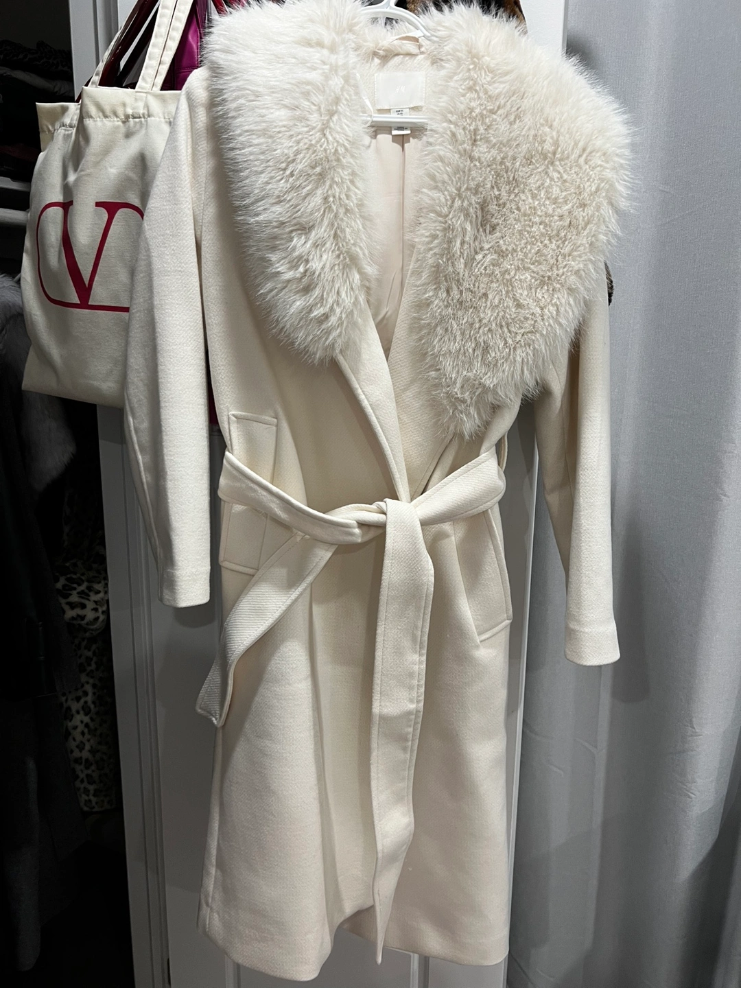 A white coat with a large faux fur collar. The coat is belted. It has long sleeves and a single button closure at the top.
