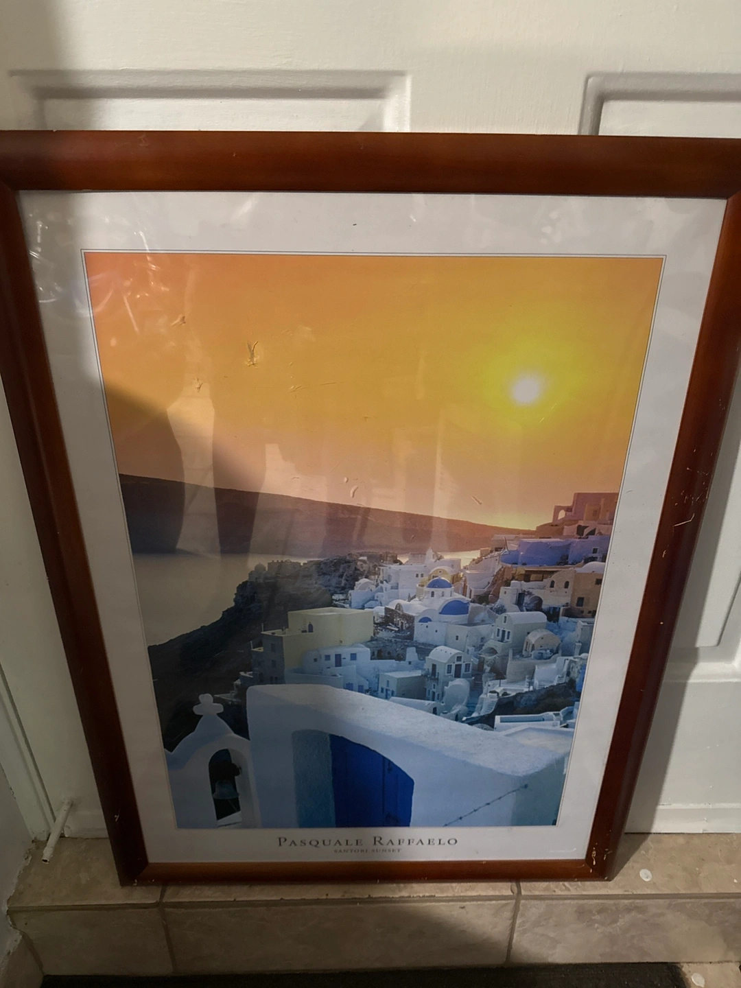 This is a framed print with a picture of a city scape at sunset. The print is signed "Pasquale Raffaello" and says "Santorini Sunset" at the bottom. It is in a brown wood frame.