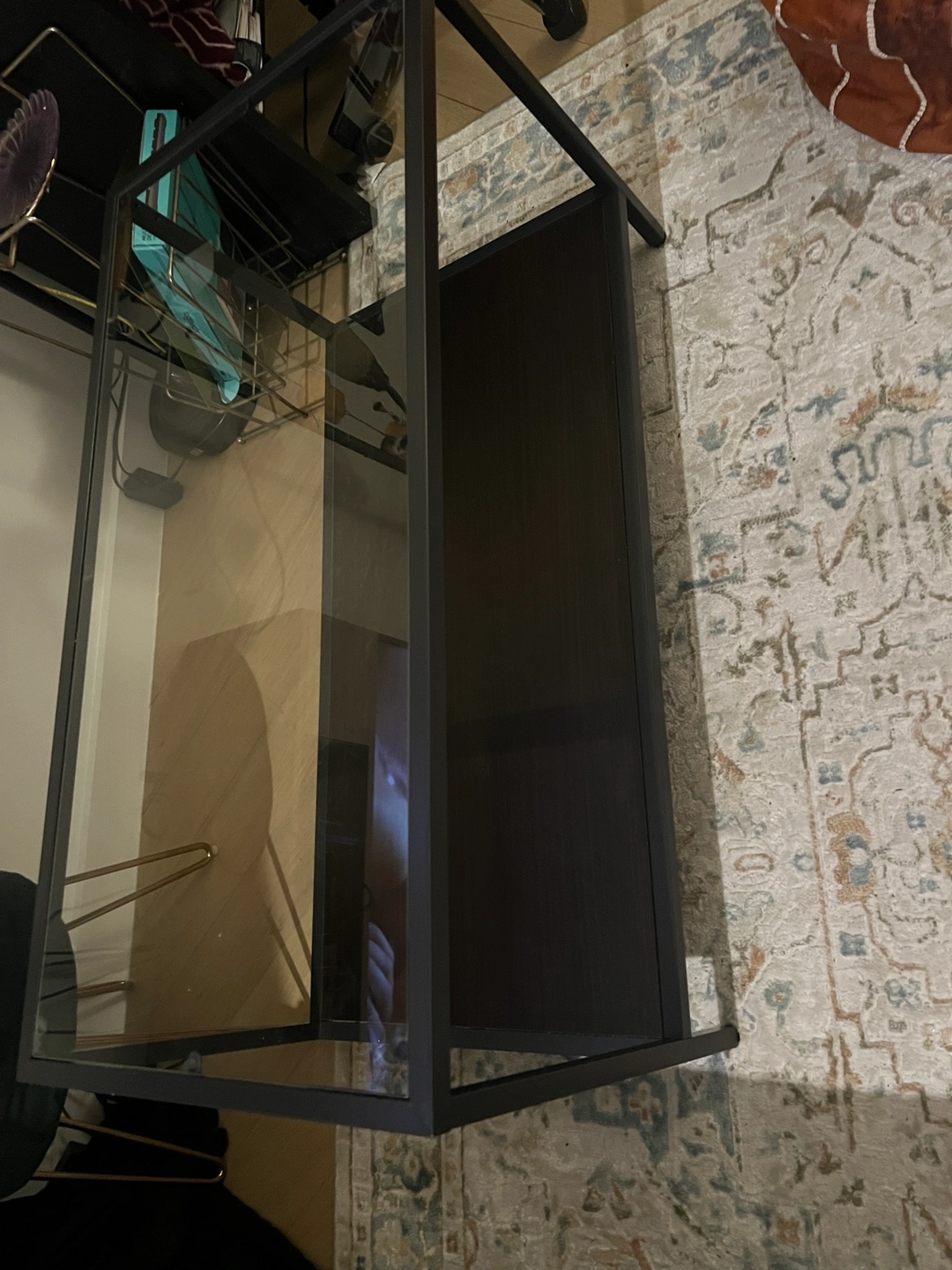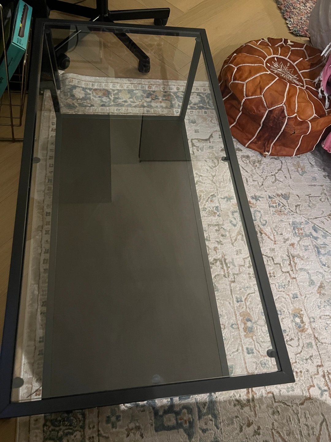 Sleek and modern coffee table featuring a clear glass top and a black metal frame. The table has a lower shelf for additional storage. Perfect for any living room or apartment.