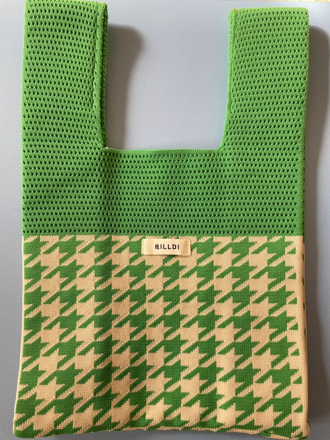 Green and tan knit bag with a houndstooth pattern. The bag has a small label with the brand name. Great as lunch bag.