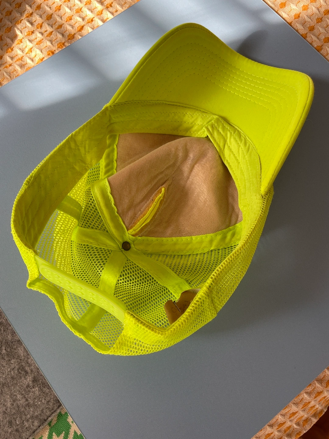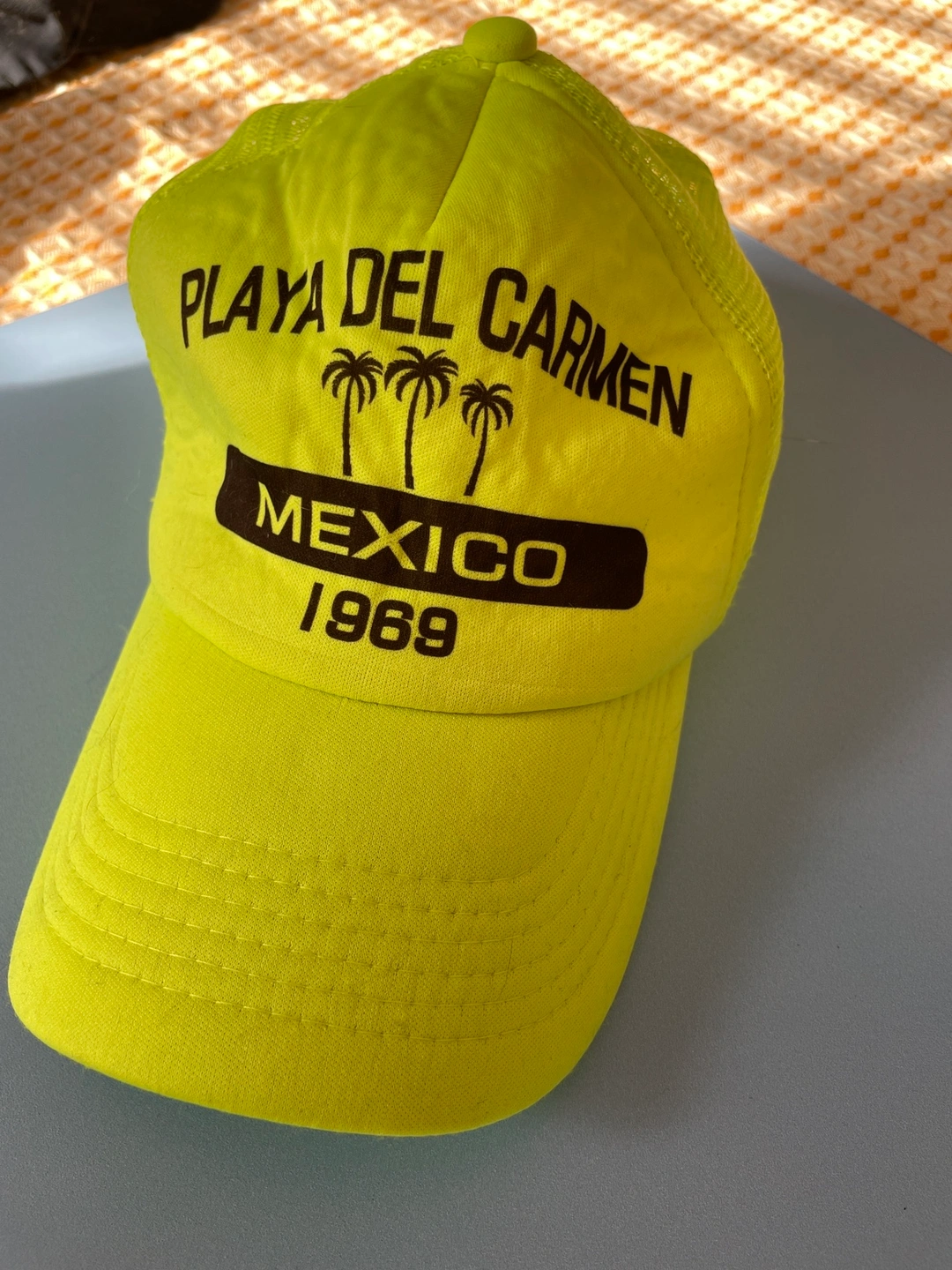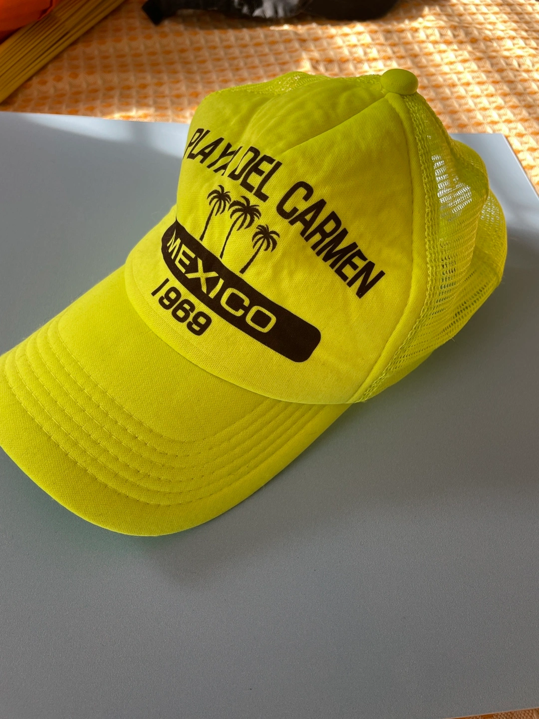 Yellow neon mesh back hat with a black logo that reads Playa Del Carmen Mexico 1969. Dry cleaner tag attached.