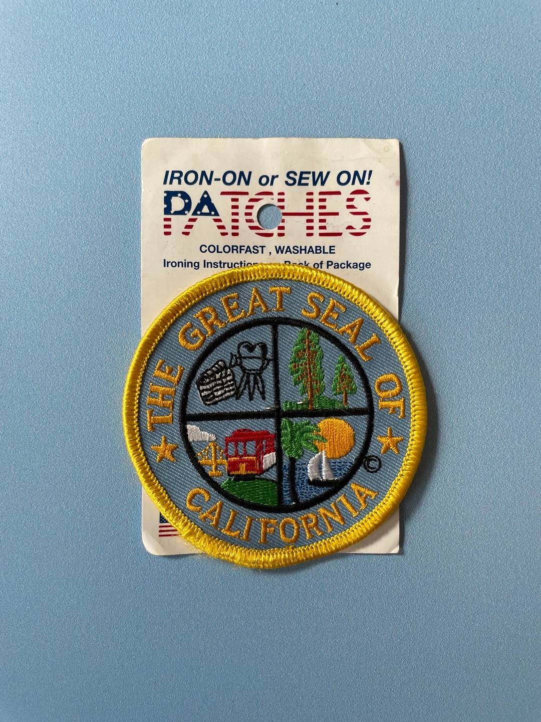 Embroidered patch with the Great Seal of California. The patch has a yellow border and is about 2.5 inches in diameter. The patch says "The Great Seal of California" and has images of a basket, a tree, a streetcar, and a sailboat. The back of the patch has instructions for ironing or sewing it on.