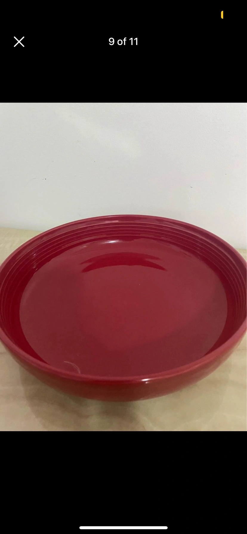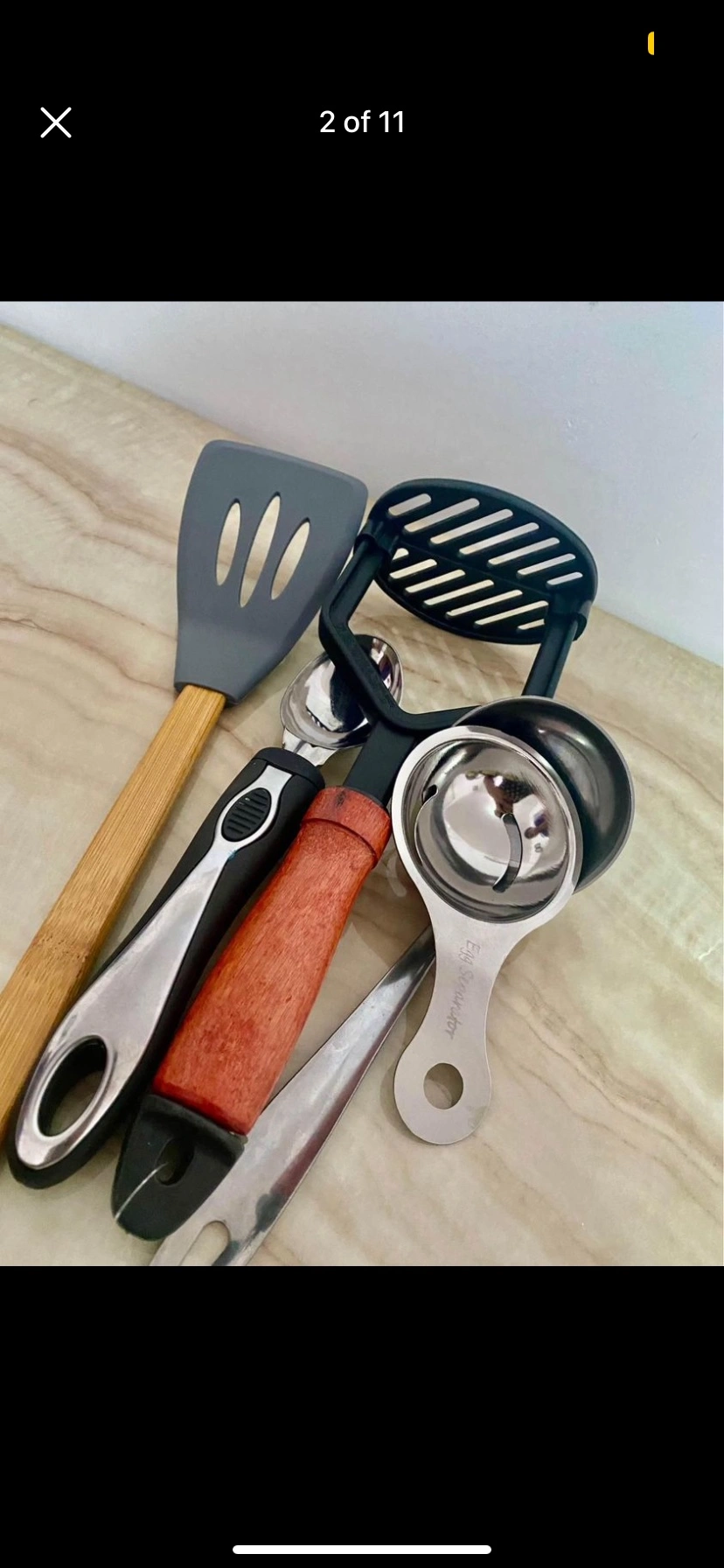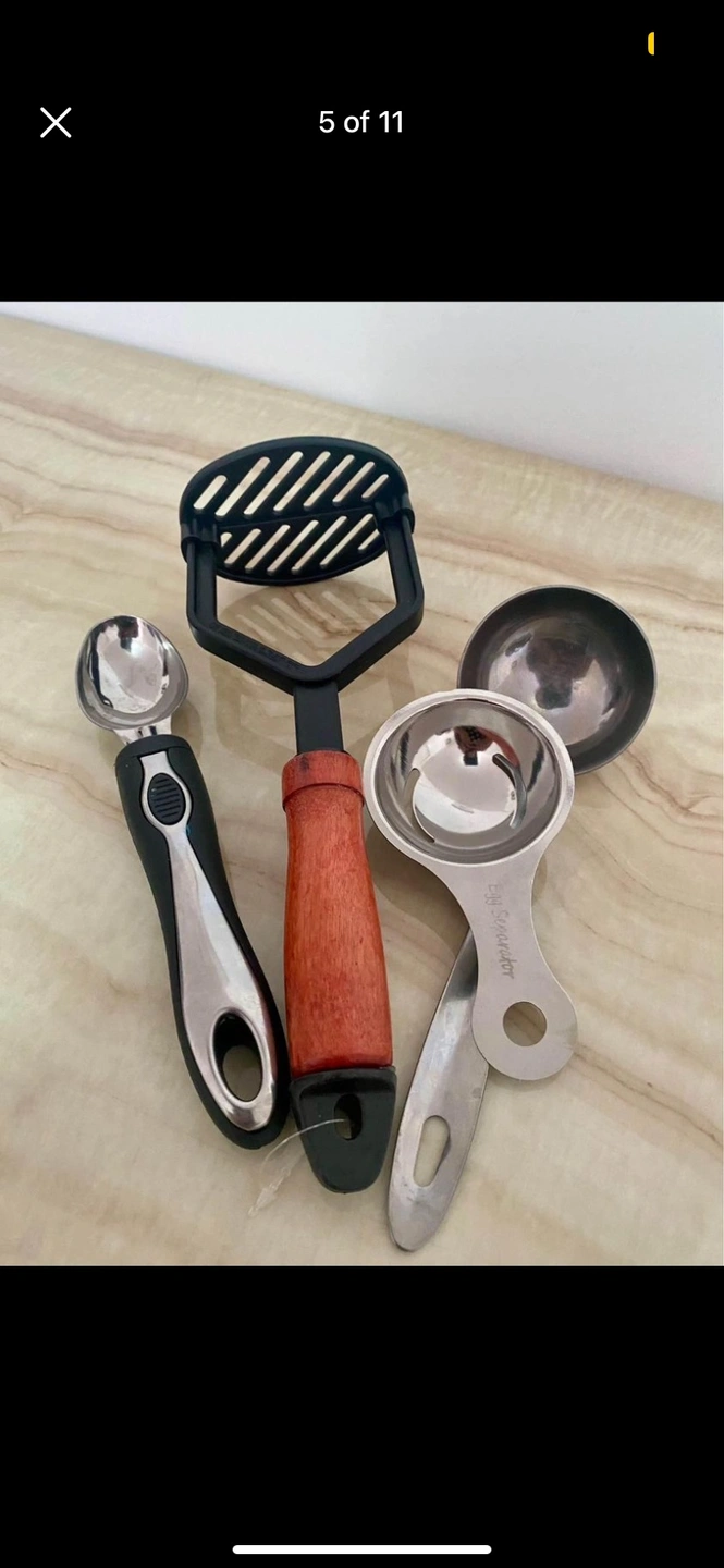 79Set of kitchen items including a red bowl, a marble pattern plate, a square plate with blue and grey stripes, a stainless steel teapot, a potato masher, a melon baller, and an egg separator.