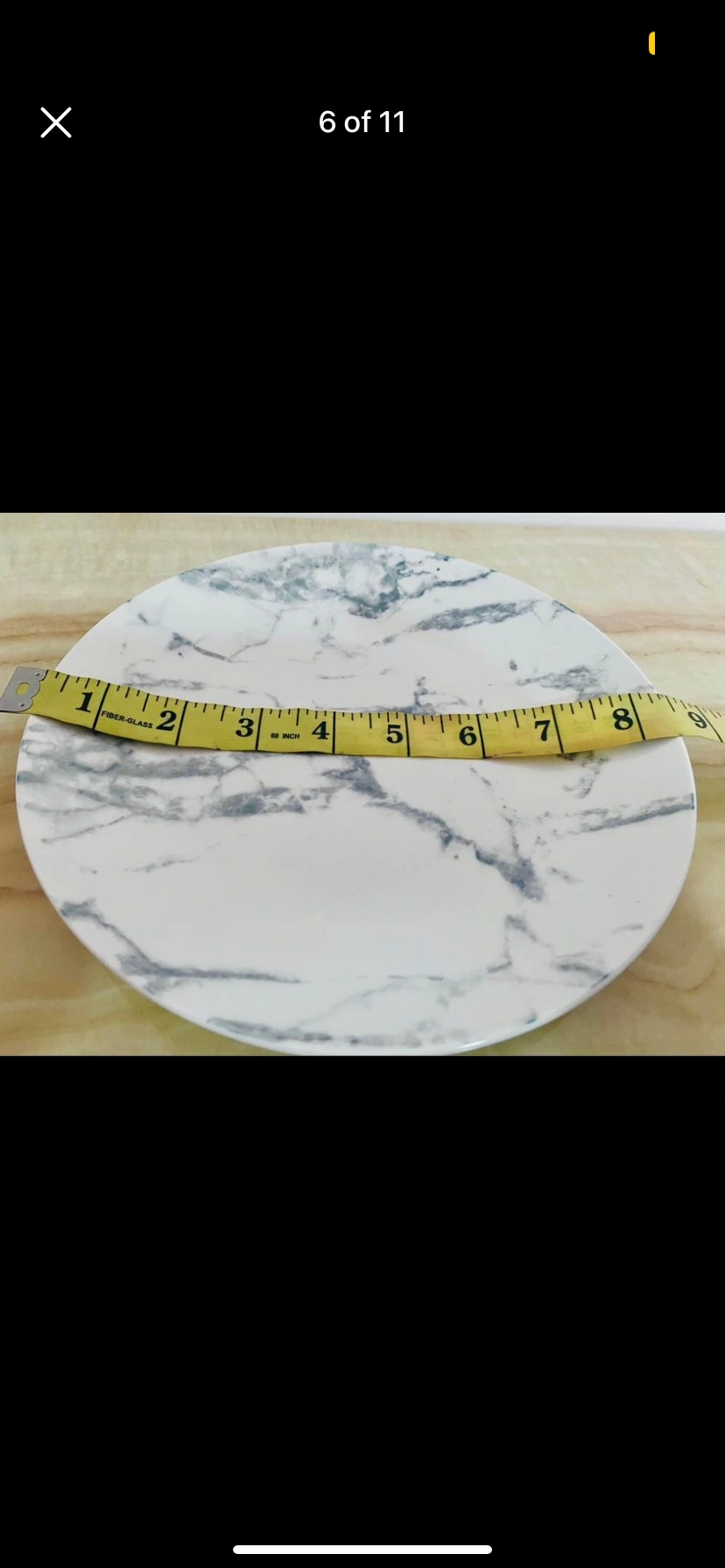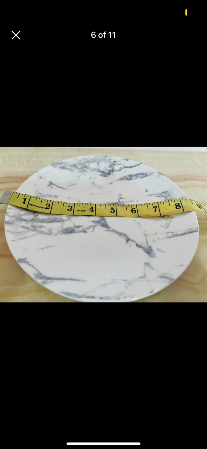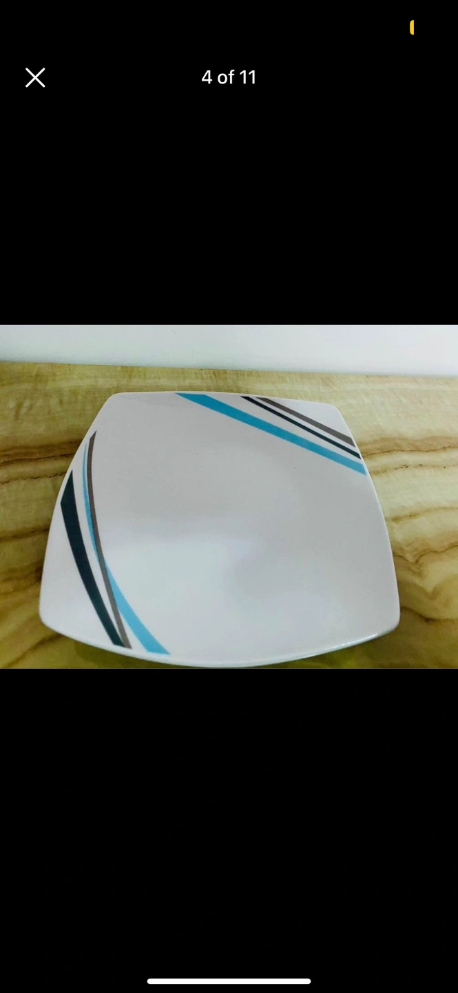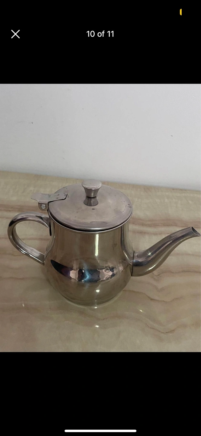 79Set of kitchen items including a red bowl, a marble pattern plate, a square plate with blue and grey stripes, a stainless steel teapot, a potato masher, a melon baller, and an egg separator.