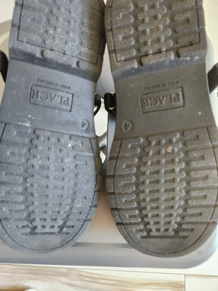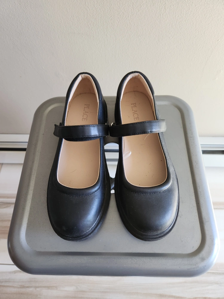 Size 4 black Mary Jane shoes. They have a strap with a buckle closure and a slightly thicker sole. The shoes are made by the brand Children's Place.