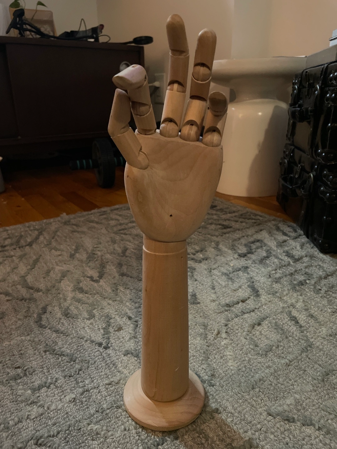 Articulated wooden hand model with a wooden base. Perfect for artists or jewelry displays!