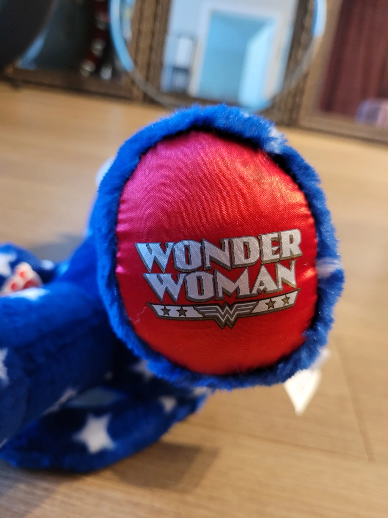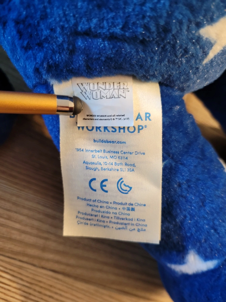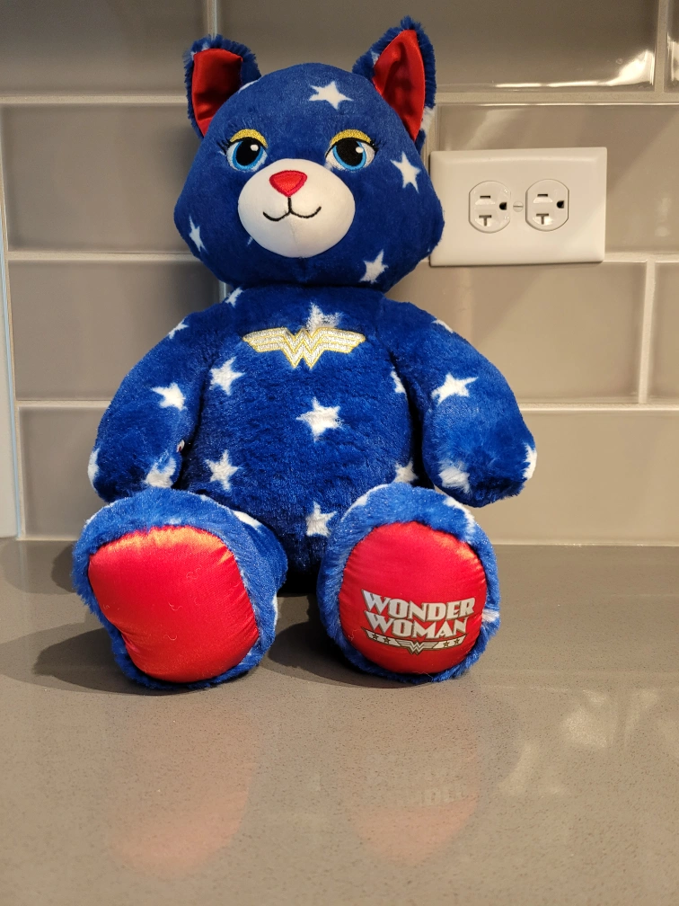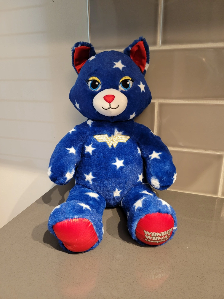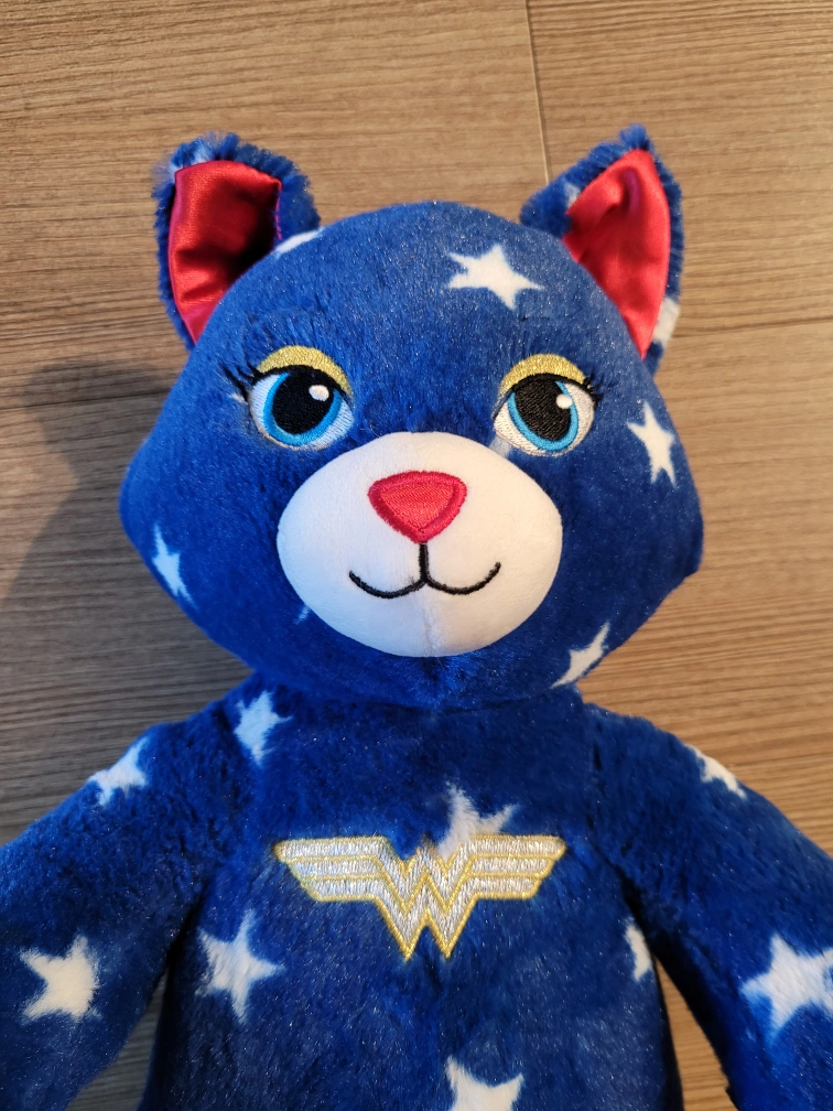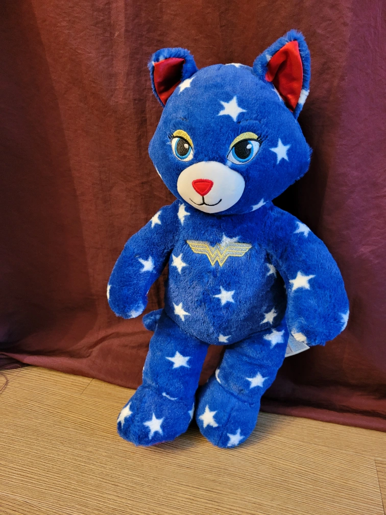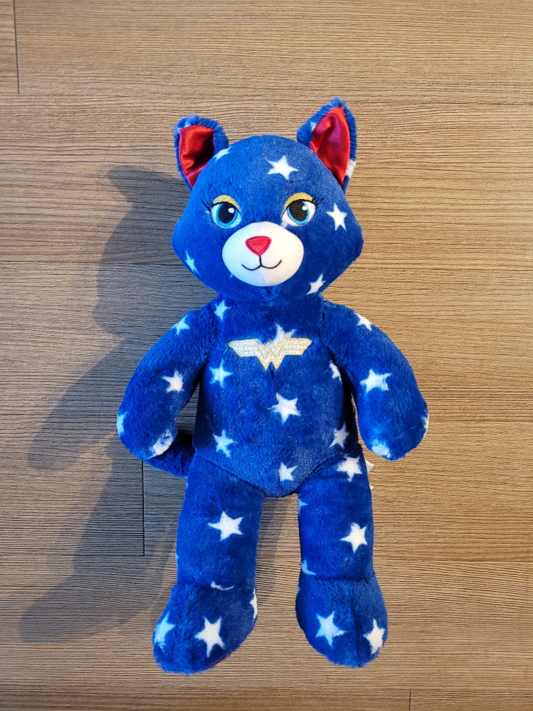Build a Bear Wonder Woman Cat Plush DC Comics Stars Blue Red Stuffed Doll USA. Build a Bear Wonder Woman Stars Justice League Cat Plush Blue White Stars. Approximately 17" long. Great condition.