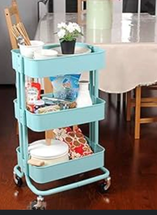 Three-tiered metal utility cart on four wheels in blue.