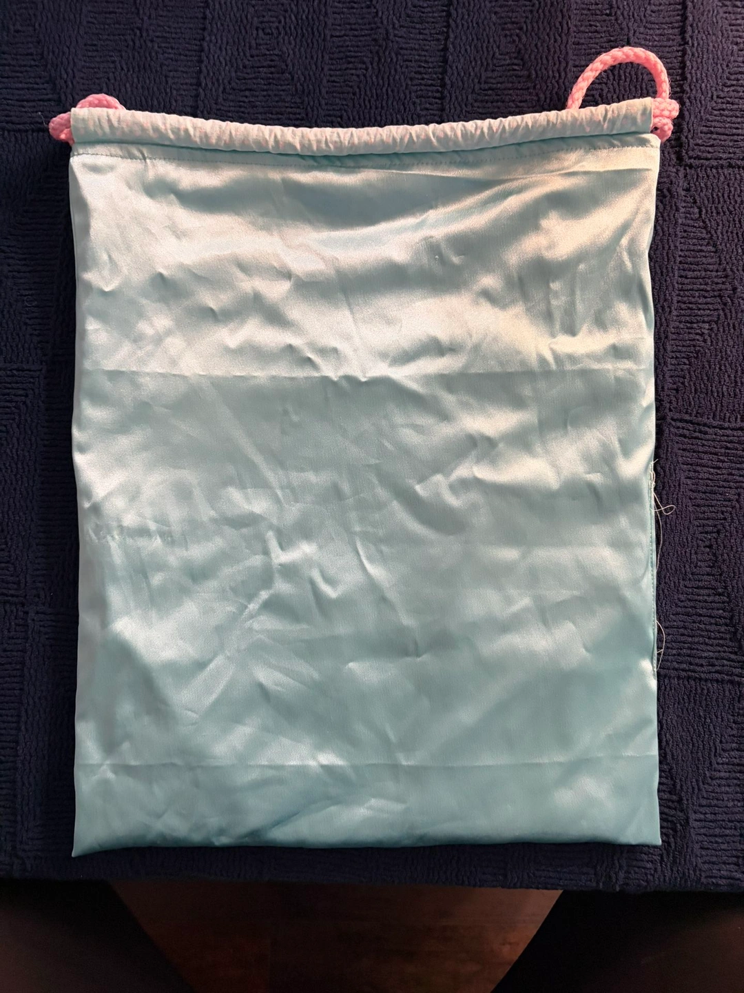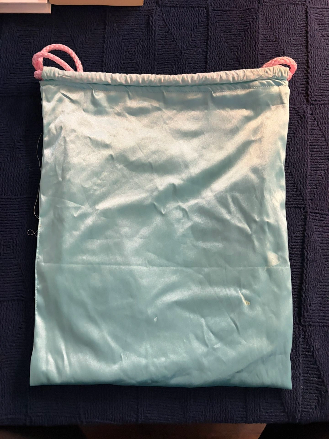 Disney Stitch drawstring bag featuring a character print on tie-dye fabric. Homemade, one of a kind. Sky blue silk interior with a tiny stain. Multicolor. Drawstring style. Post 1940.