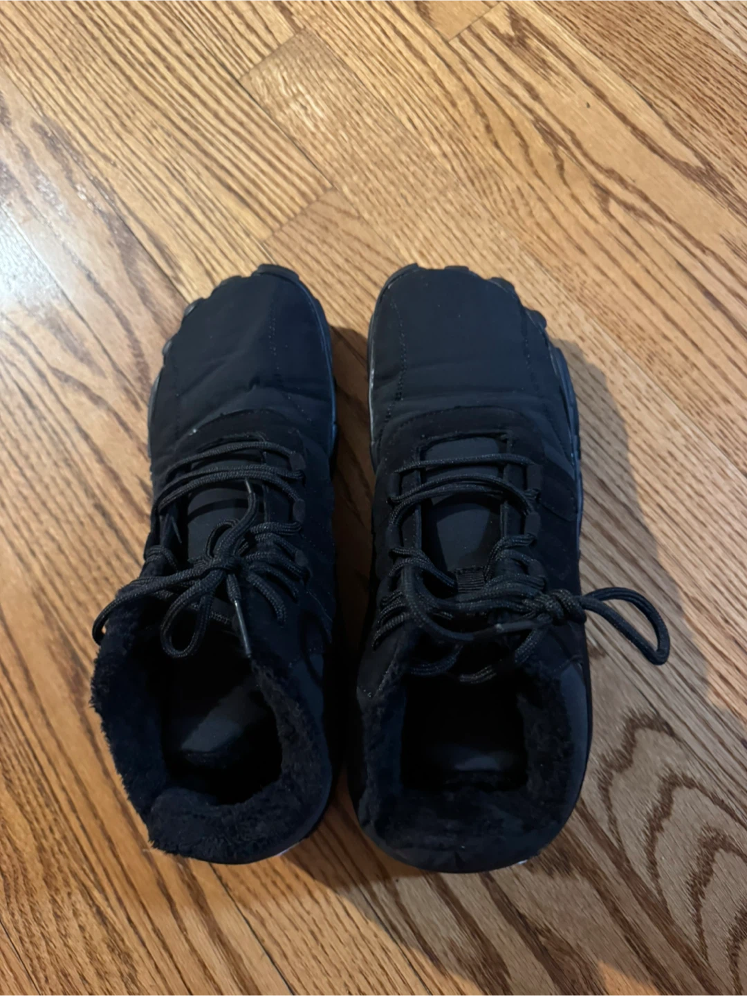 These black sneakers have a plush fur lining for extra warmth. They feature a lace-up closure for a secure fit. Perfect for colder weather! bye bye my shoes...
