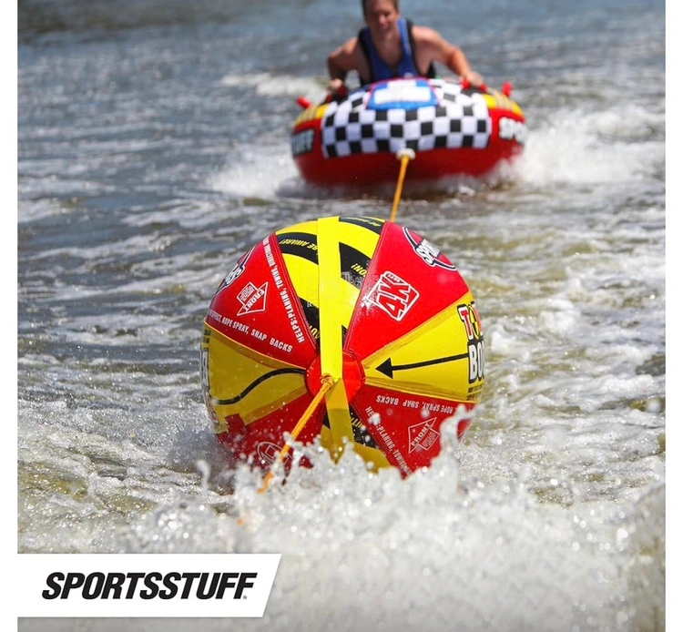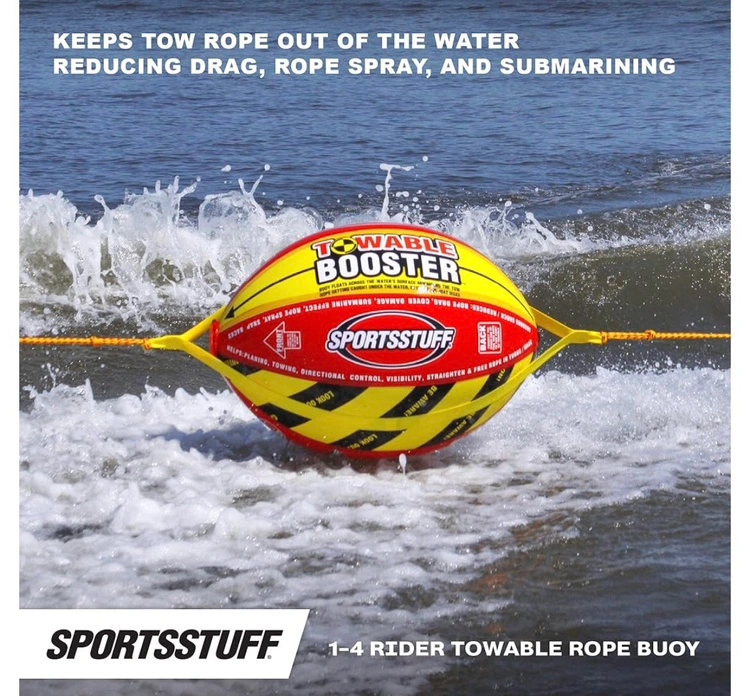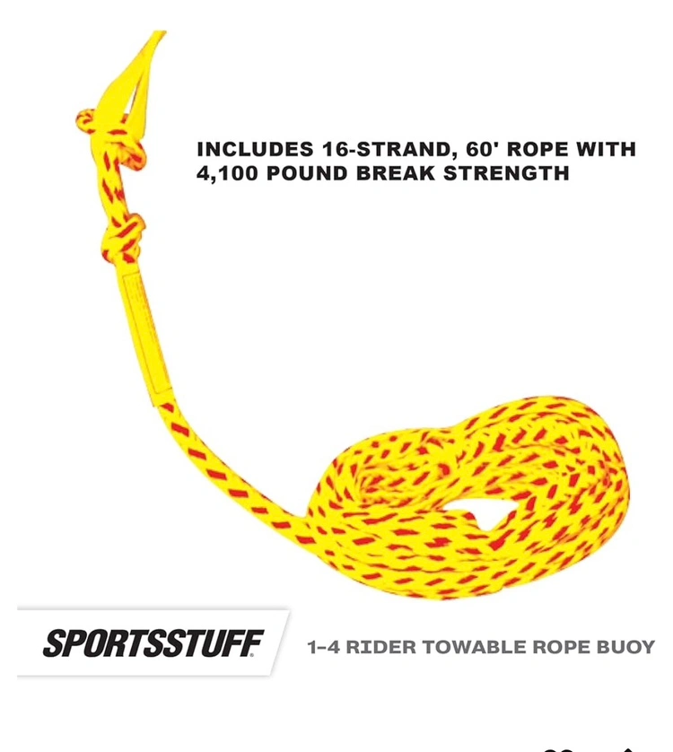 75This is a 1-4 person towable rope buoy that is designed to enhance the performance of most towables. It comes with a 16-strand, 60' rope with 4,100 pound break strength.