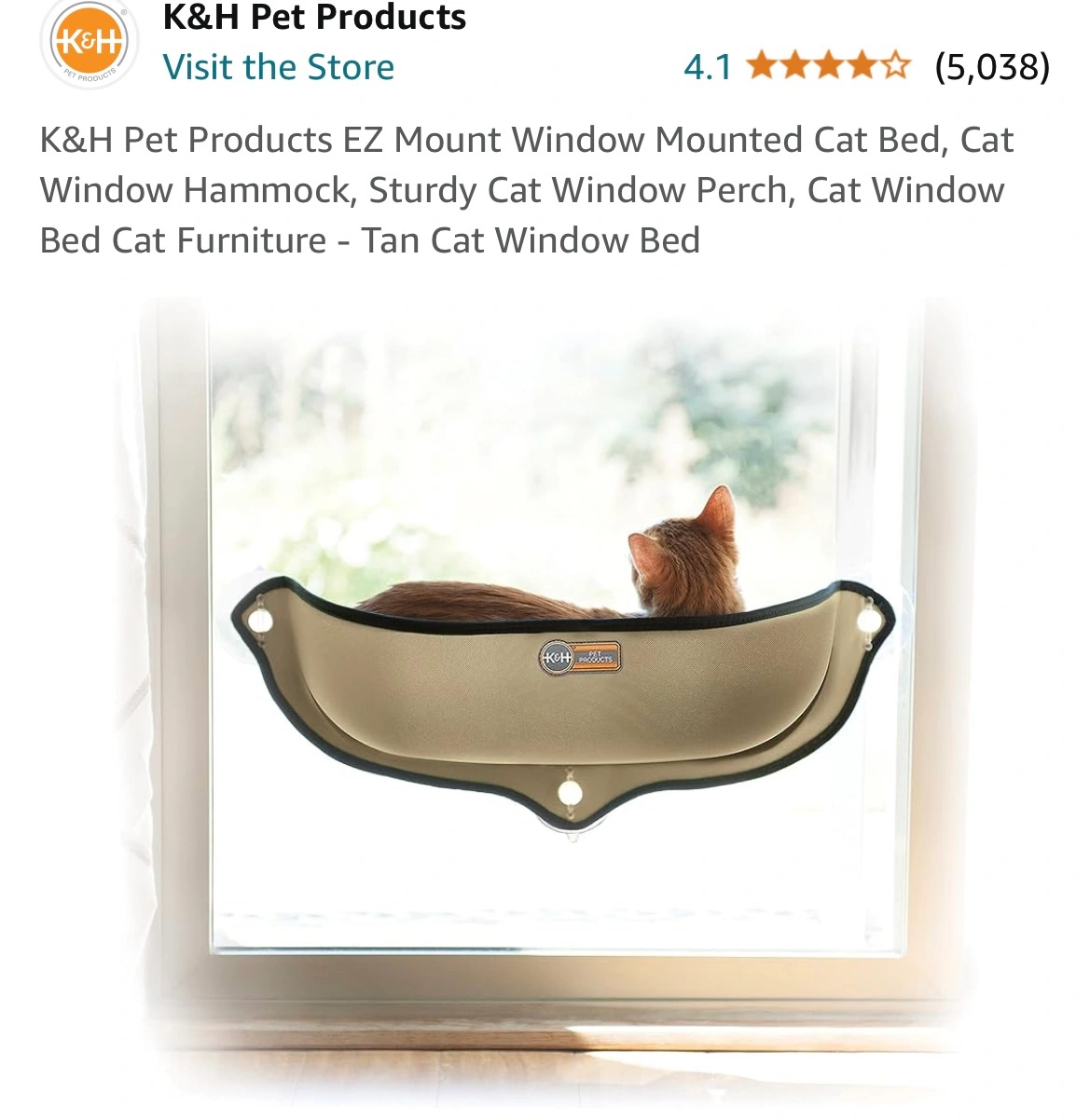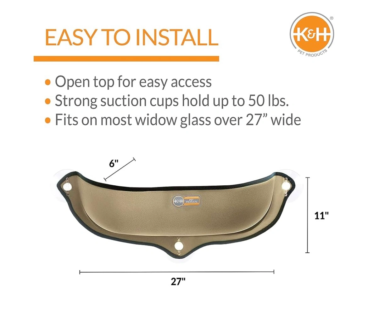 613This is a cat bed that mounts to your window. It is tan in color and measures approximately 27" wide, 11" high and 6" deep. It has strong suction cups to hold it in place. The top is open for easy access.