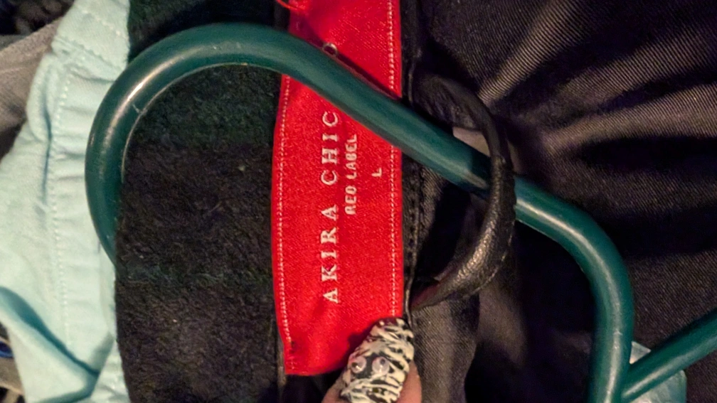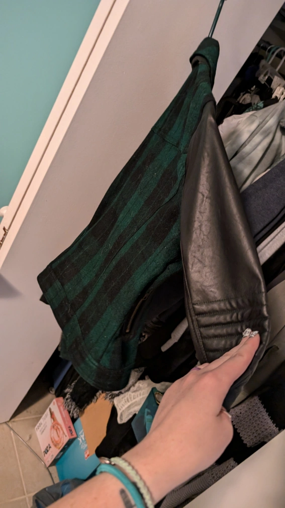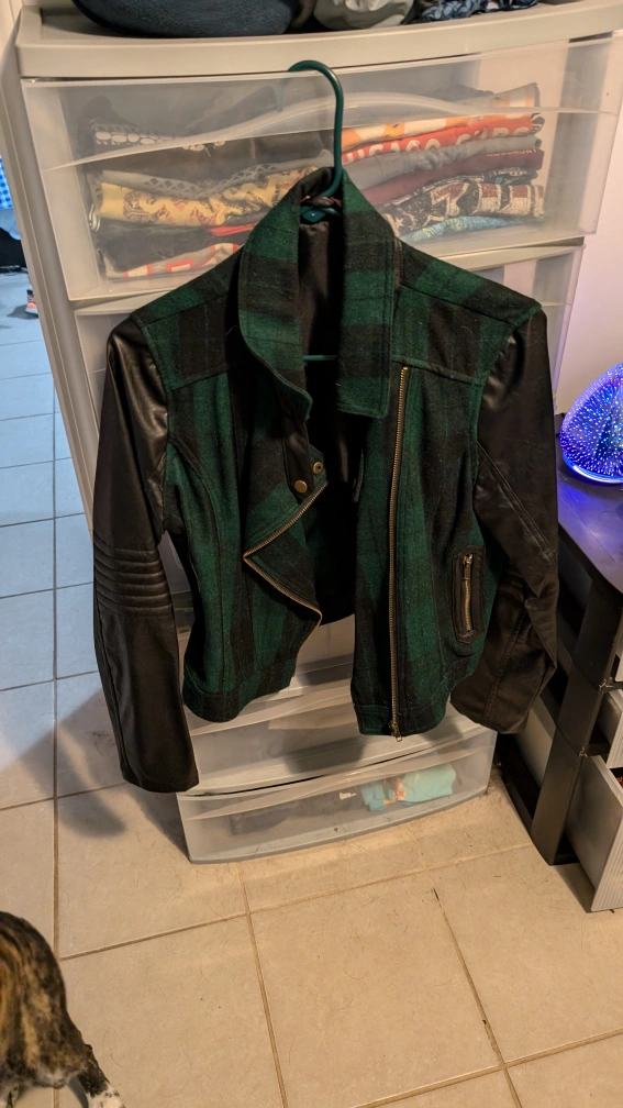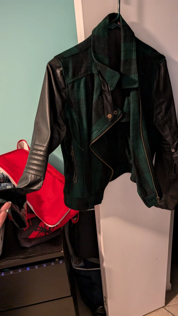 58Size Large, Green plaid jacket with black faux leather sleeves. Has a zipper closure in the front. See photo of small tear in outer shell under one arm, does not go all the way through. From home with dogs. North Center (Chicago) near Damen & Montrose