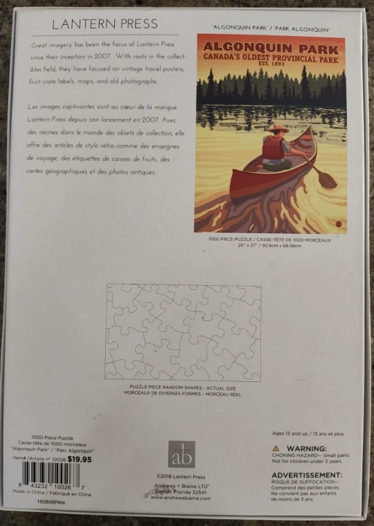 This is a 1000 piece jigsaw puzzle featuring a vintage image of Algonquin Park, Canada's oldest provincial park. It is part of the Canadian Collection by Lantern Press.