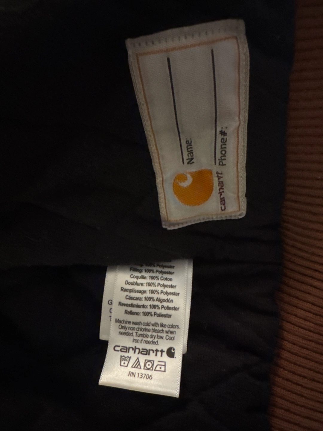 177Carhartt brown jacket with a hood, size 2T. The jacket has a zipper closure. It is lined with black quilted fabric. The jacket also has a Carhartt patch on the chest.