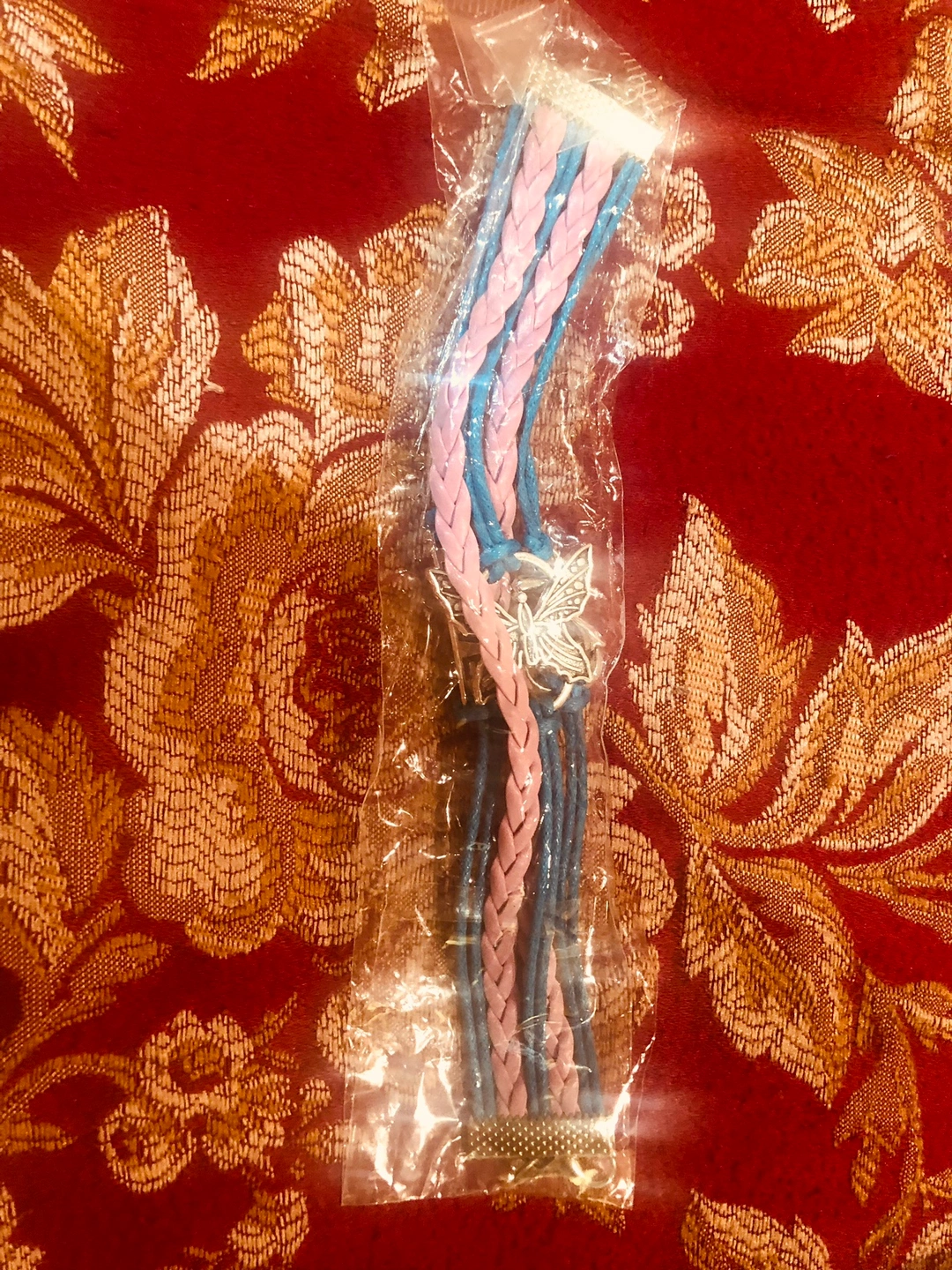 442A braided bracelet with a silver butterfly charm. It is blue and pink and has a clasp.