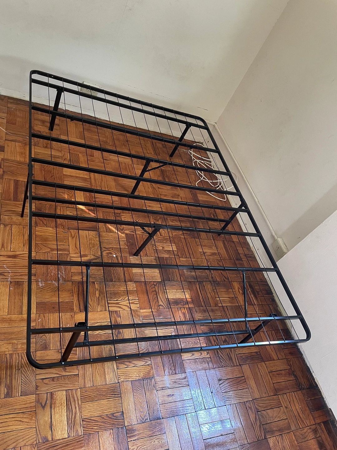 Full size bed frame and mattress. Both are in good condition. Less than a year old. The bed frame is metal and folds to close and the mattress is wrapped in plastic. Cross posted.