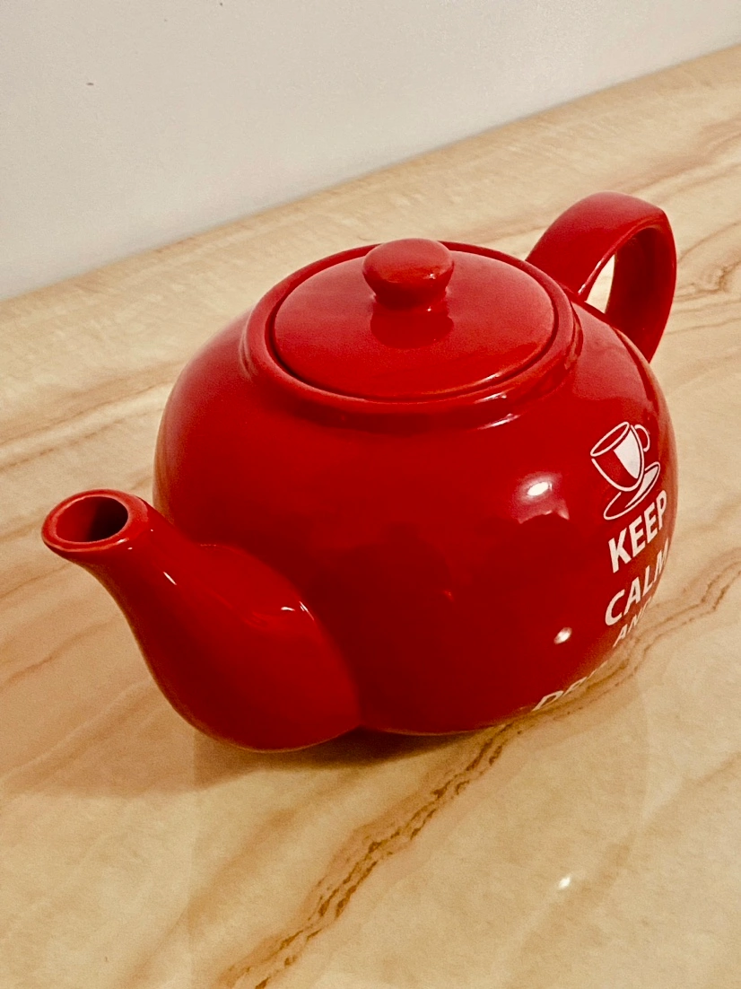79Red ceramic teapot with "Keep Calm and Drink Tea" written on the side.