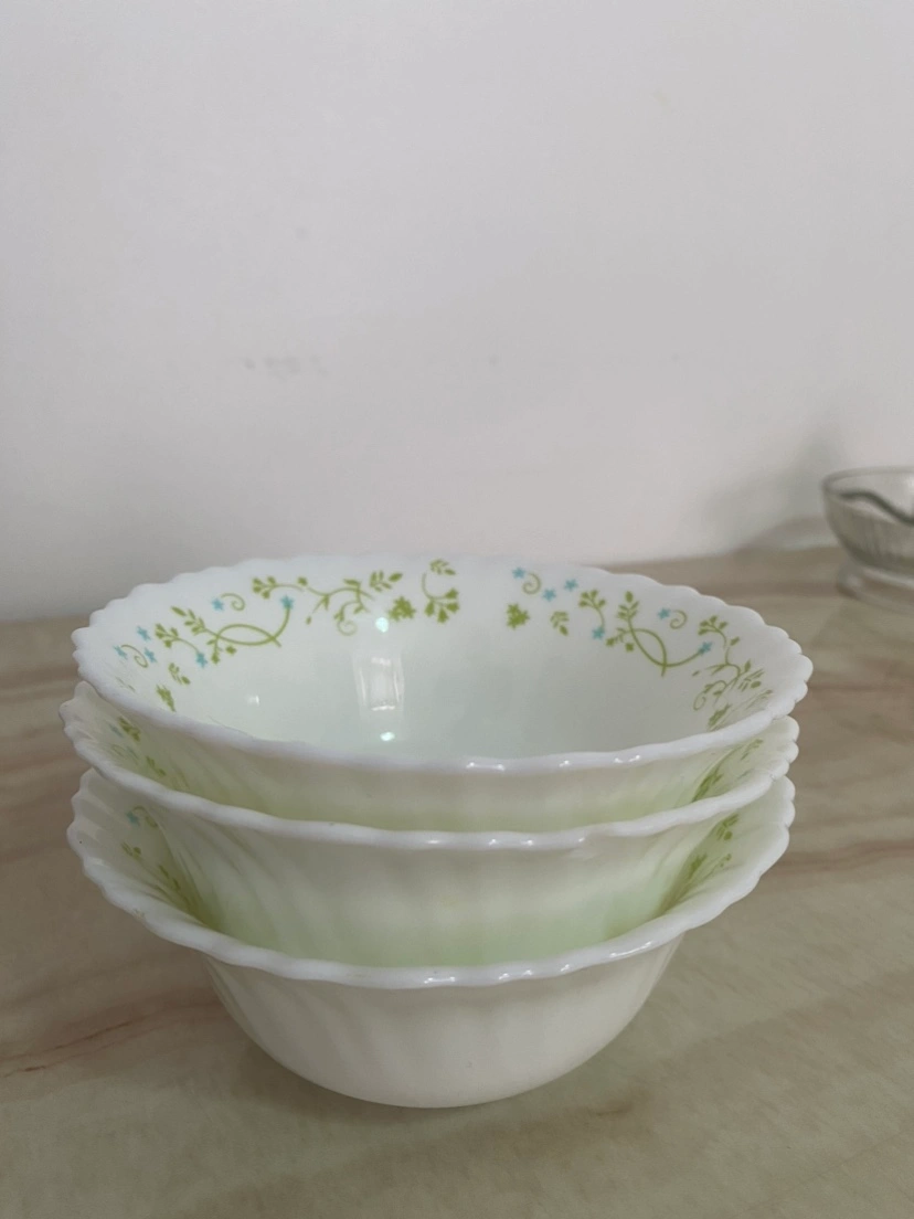 82Three white bowls with a floral design. The bowls are slightly fluted around the edge.