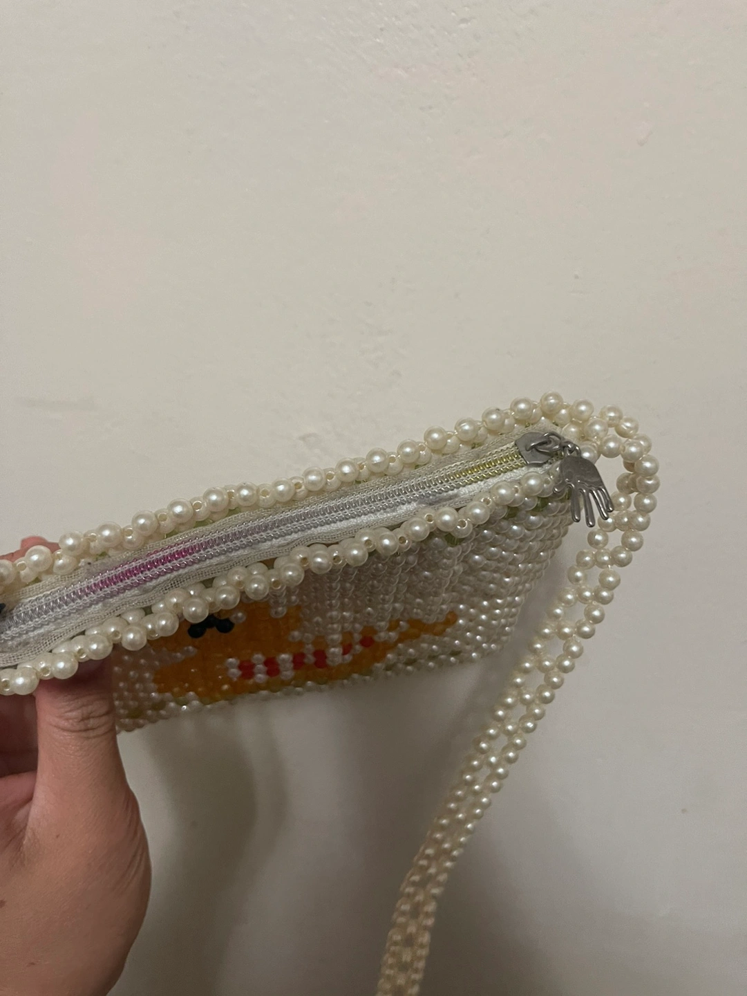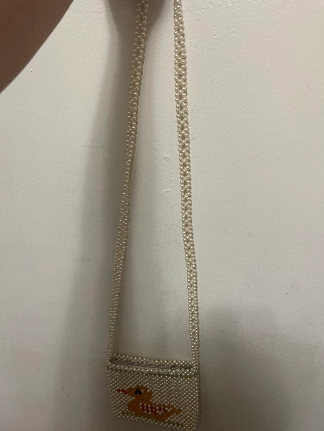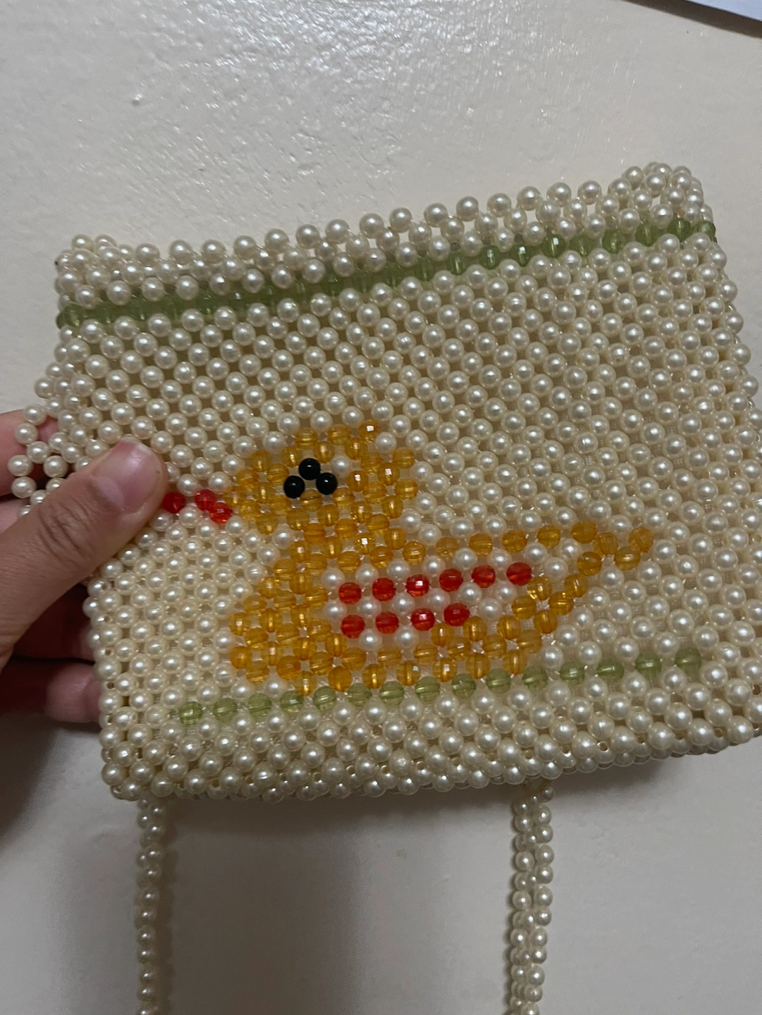 Cute beaded bag with a duck design. It has a long strap and a zipper closure. This bag is great for carrying your essentials.