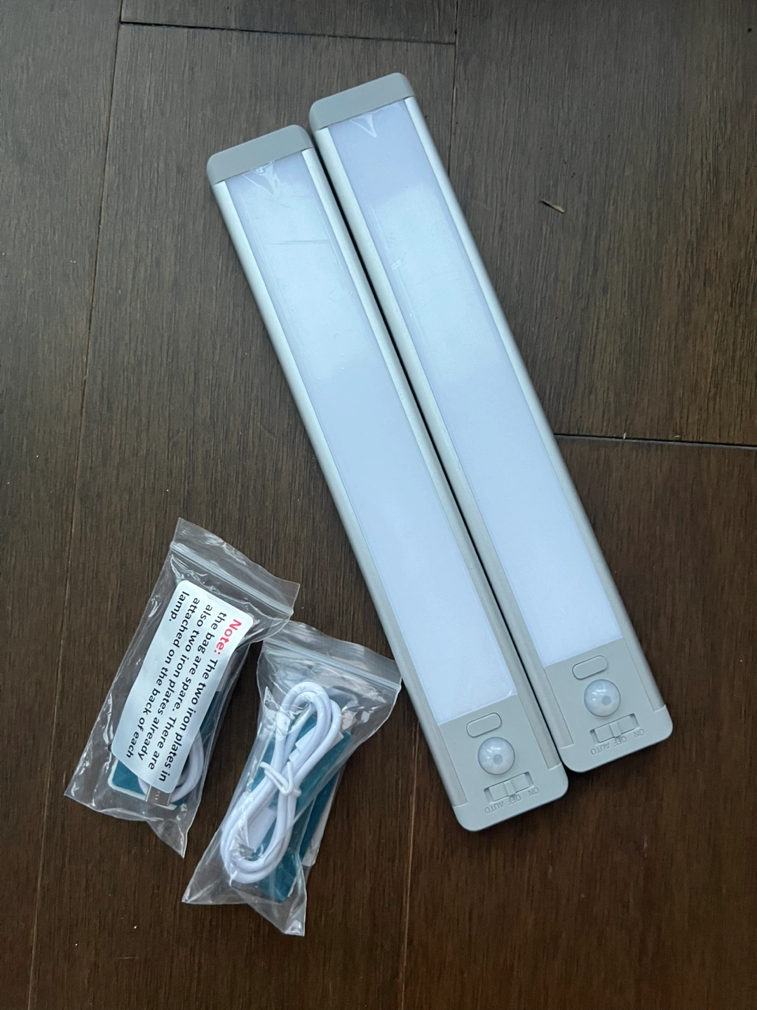 Selling a set of two LED under cabinet lights. They have an on/off/auto switch for easy control. Included are spare iron plates and charging cables. They’re metallic!