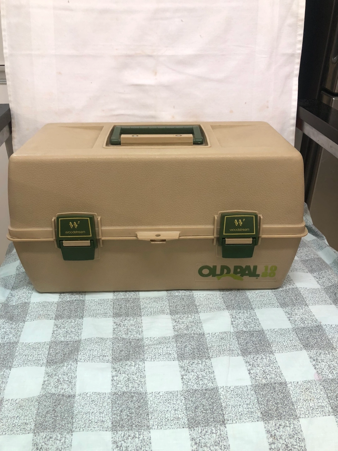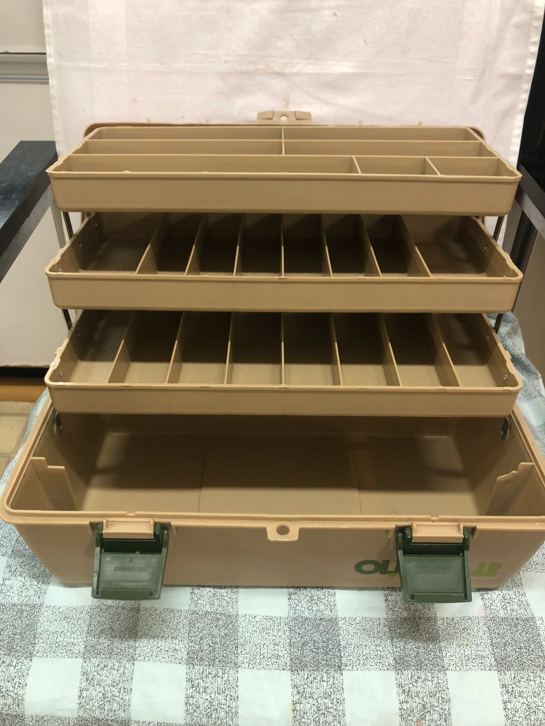 Three-tier tackle box with multiple compartments. It is tan with green latches and a handle.