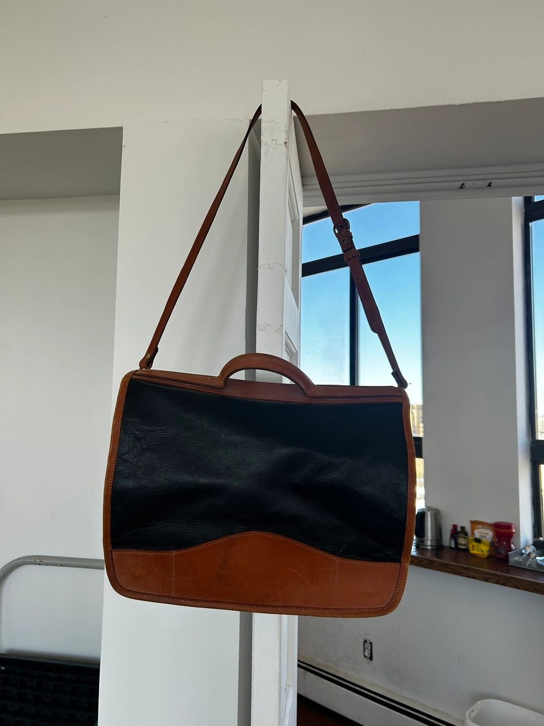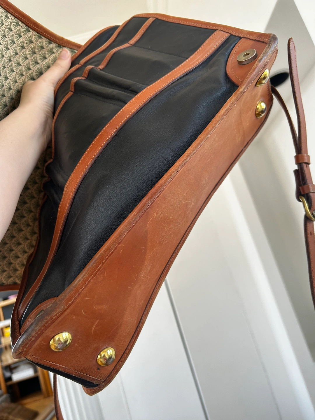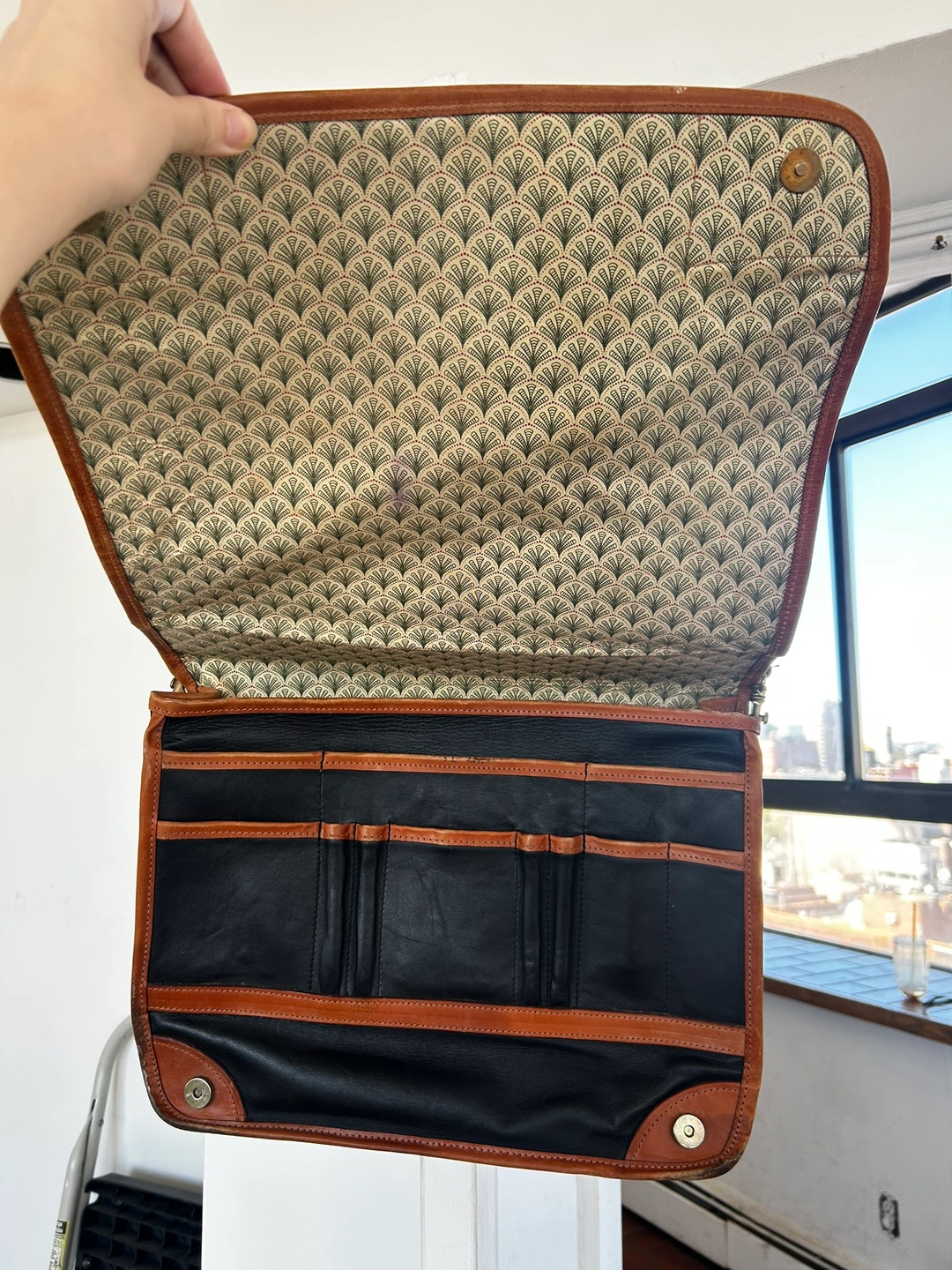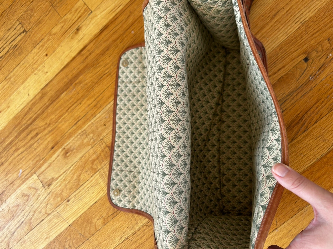 Vintage Leather Travel Bag. 15.5" x 12". Solid condition. Features removable buckle strap and beautiful interior pattern. 4 studs at the bottom as well.