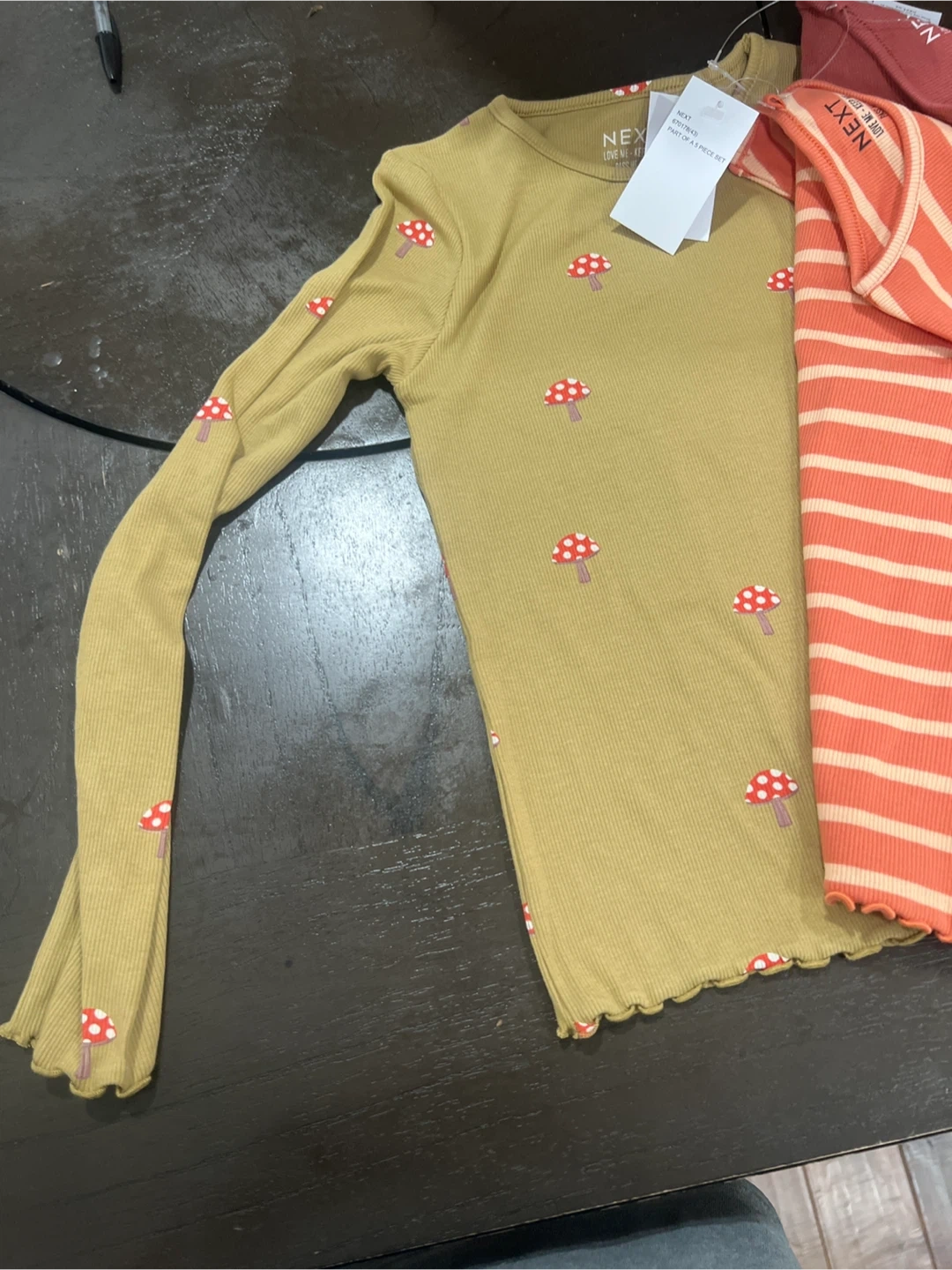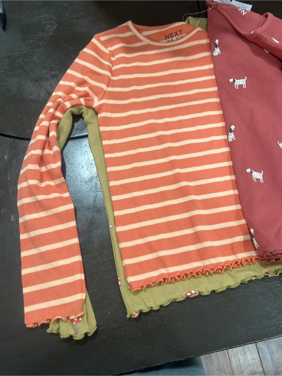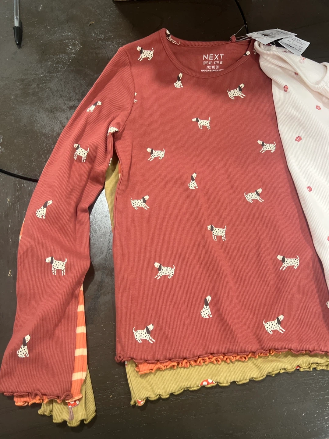 Here's a set of 4 long-sleeve rib tops from Next, perfect for a child aged 6-7 years! These tops come in a variety of colors and patterns, including pink, red with dog prints, olive with mushroom prints, and orange stripes. The original tag shows they retail for $48