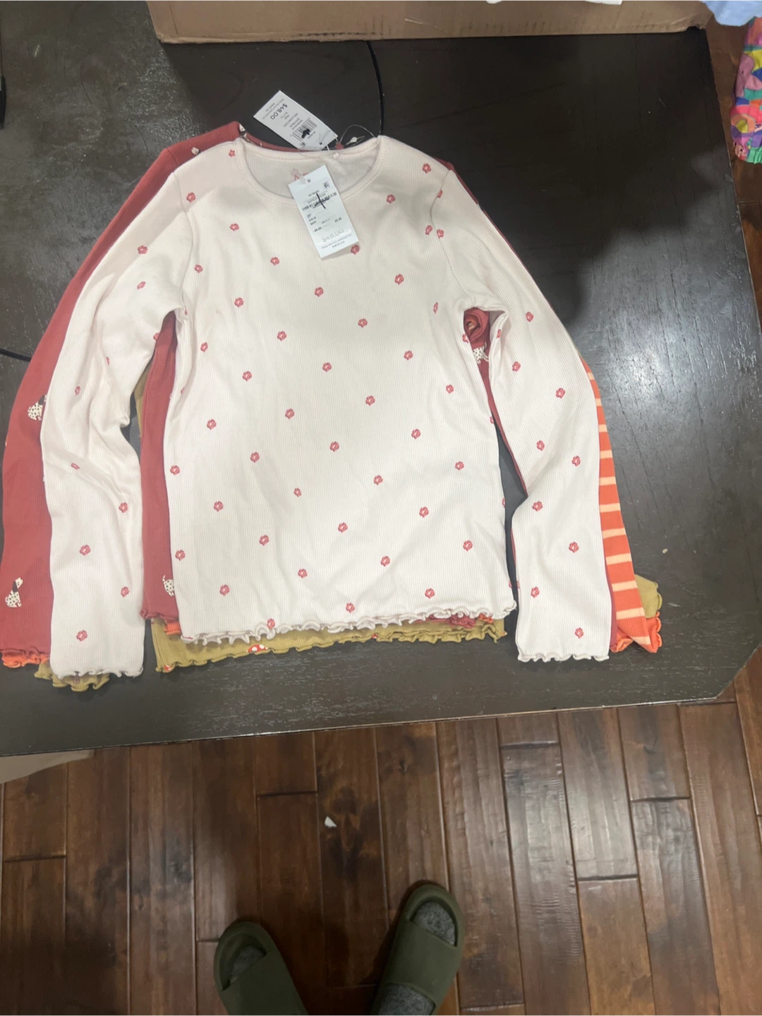 Here's a set of 4 long-sleeve rib tops from Next, perfect for a child aged 6-7 years! These tops come in a variety of colors and patterns, including pink, red with dog prints, olive with mushroom prints, and orange stripes. The original tag shows they retail for $48