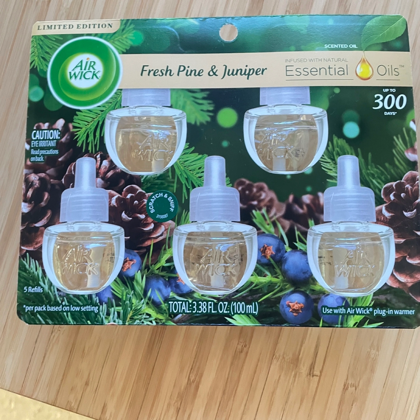 Limited Edition Air Wick scented oil refill. Fresh Pine & Juniper scent. 5 refills in the pack. Infused with natural essential oils. Up to 300 days of fragrance.