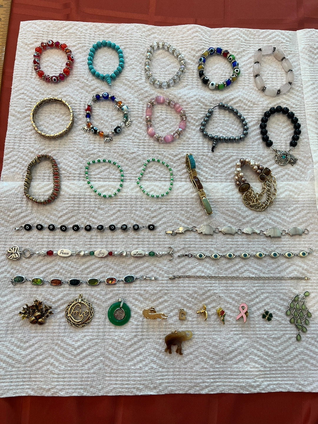 98Assortment of bracelets, charms, and pendants. Includes several beaded bracelets, silver bracelets, and charms. Some bracelets are stretch bracelets and some have clasps.