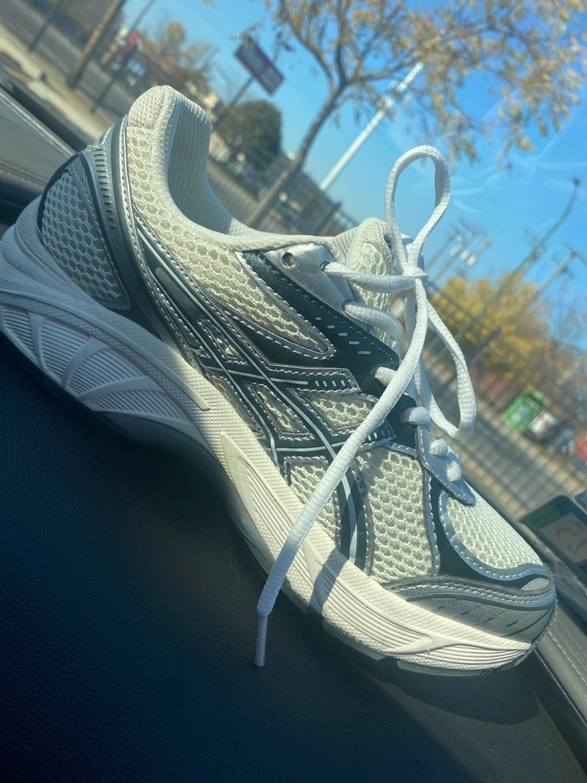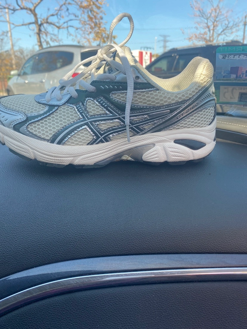 White and grey running shoes. Mesh material. Some wear and tear. Size 7.