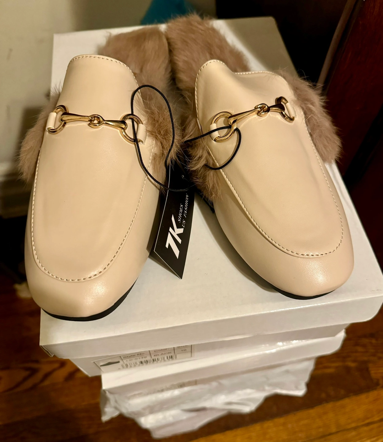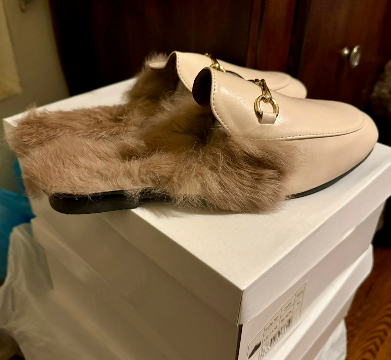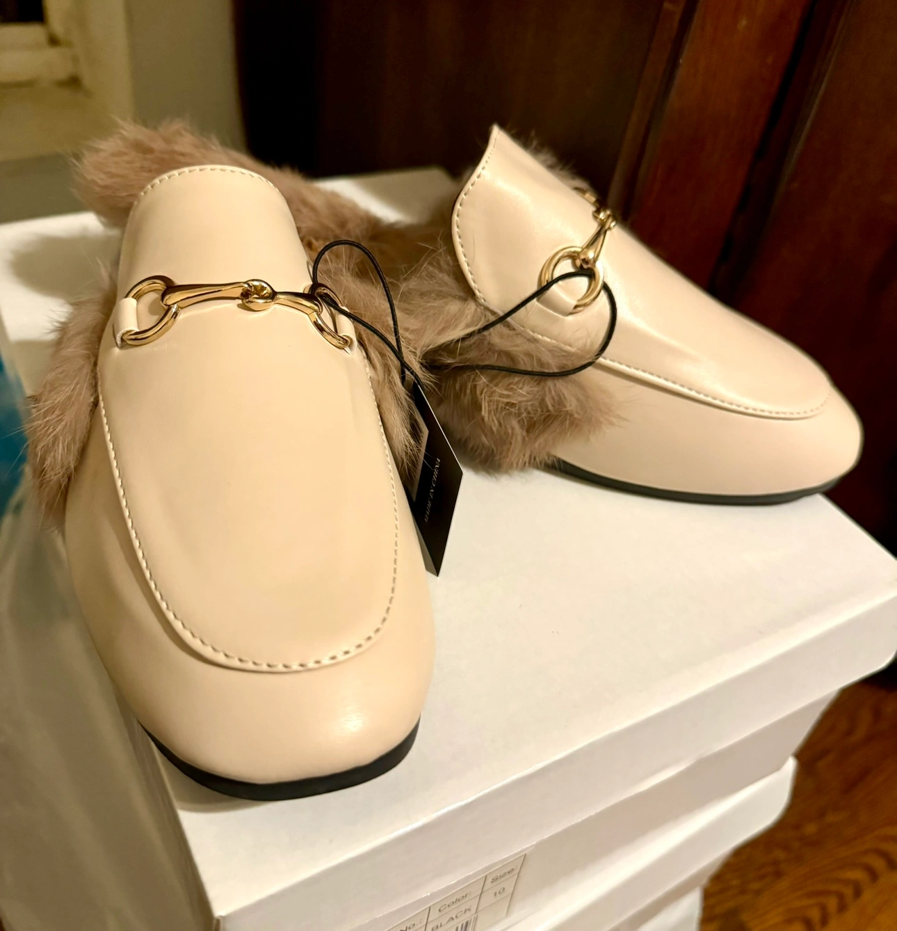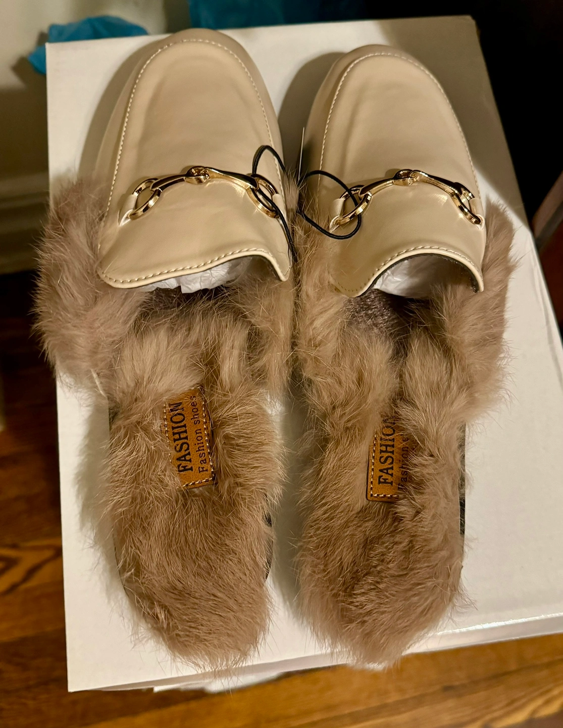 Cream faux fur mules with a gold chain accent. Pu leather Very comfy and cool style New in box Size 9 Available also in black More sizes 👈