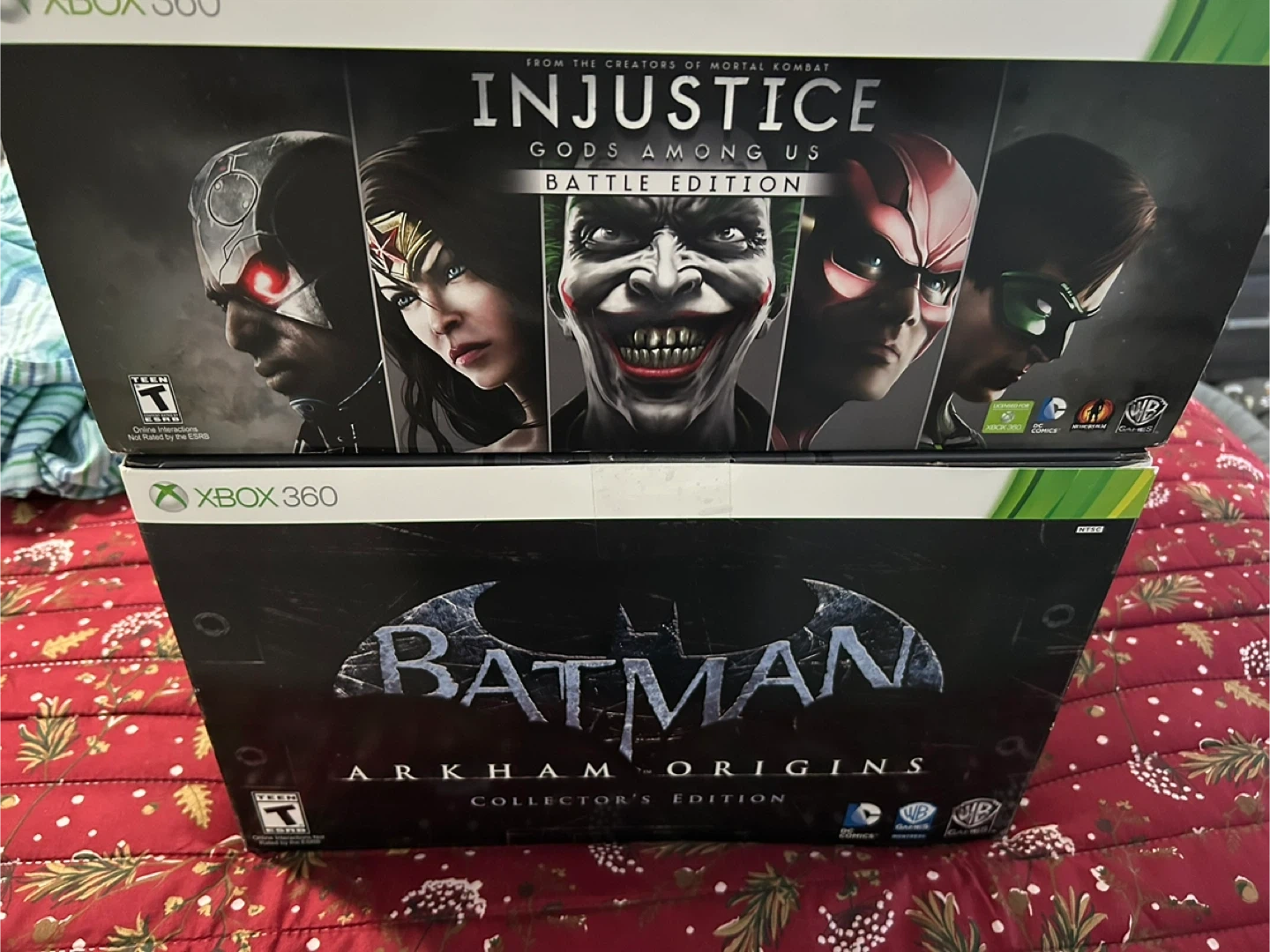 Two Xbox 360 collector's editions. Includes Injustice Gods Among Us Battle Edition and Batman Arkham Origins Collector's Edition. These are game collector's editions for the Xbox 360 console.