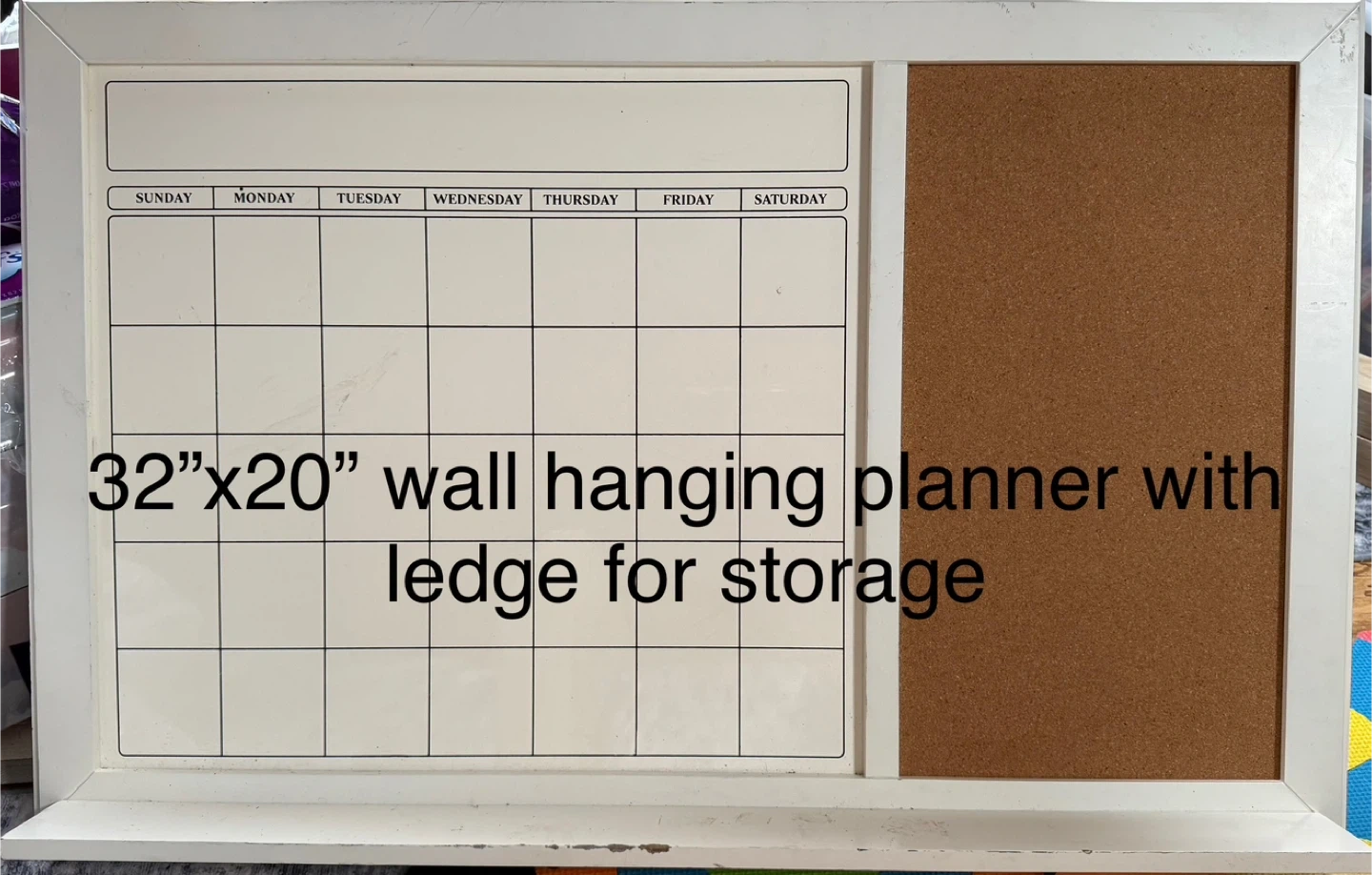 Selling a wall hanging planner with a ledge for storage. It's 32"x20" and has a section for each day of the week, as well as a cork board section on the side