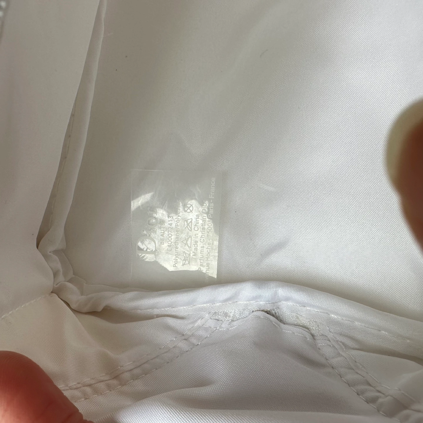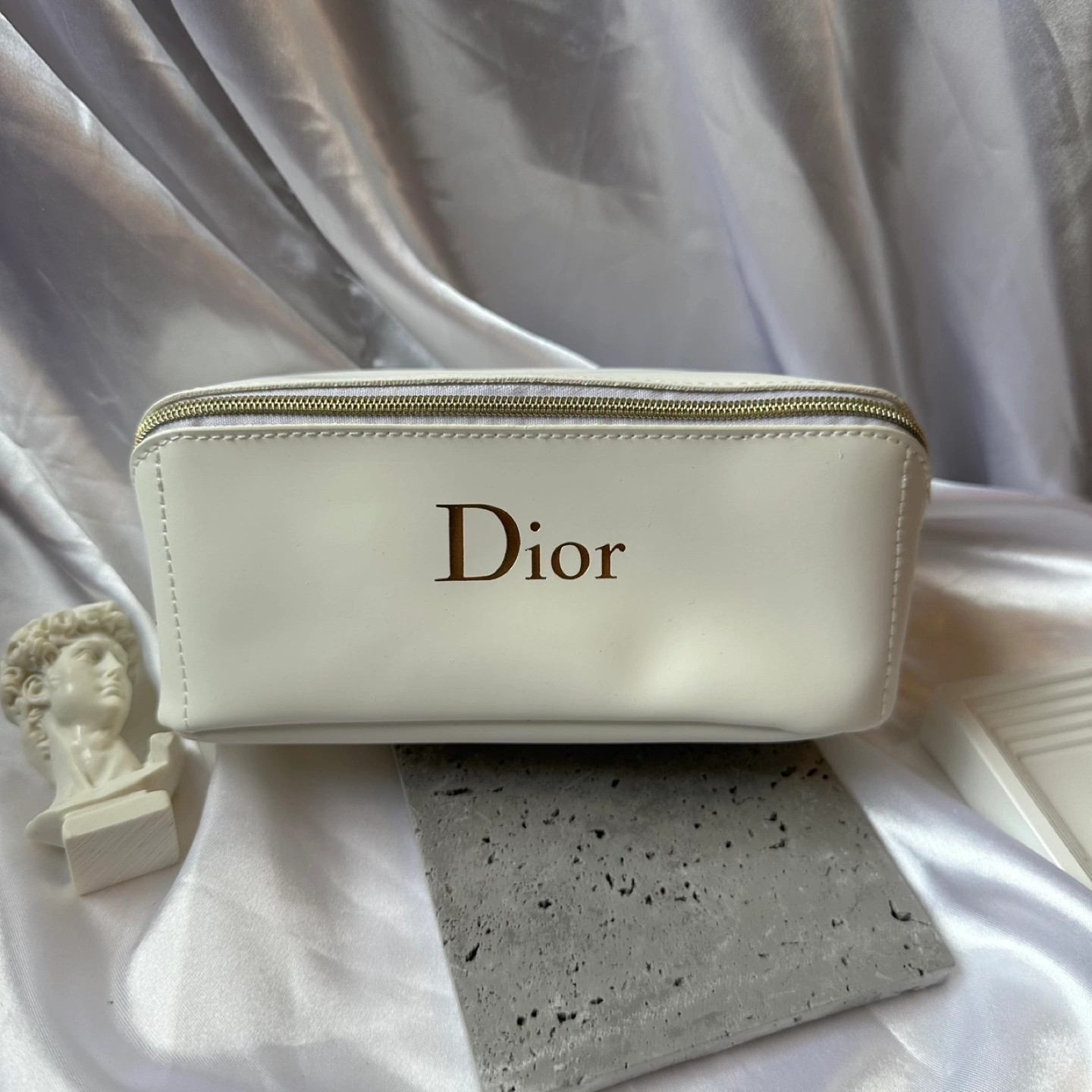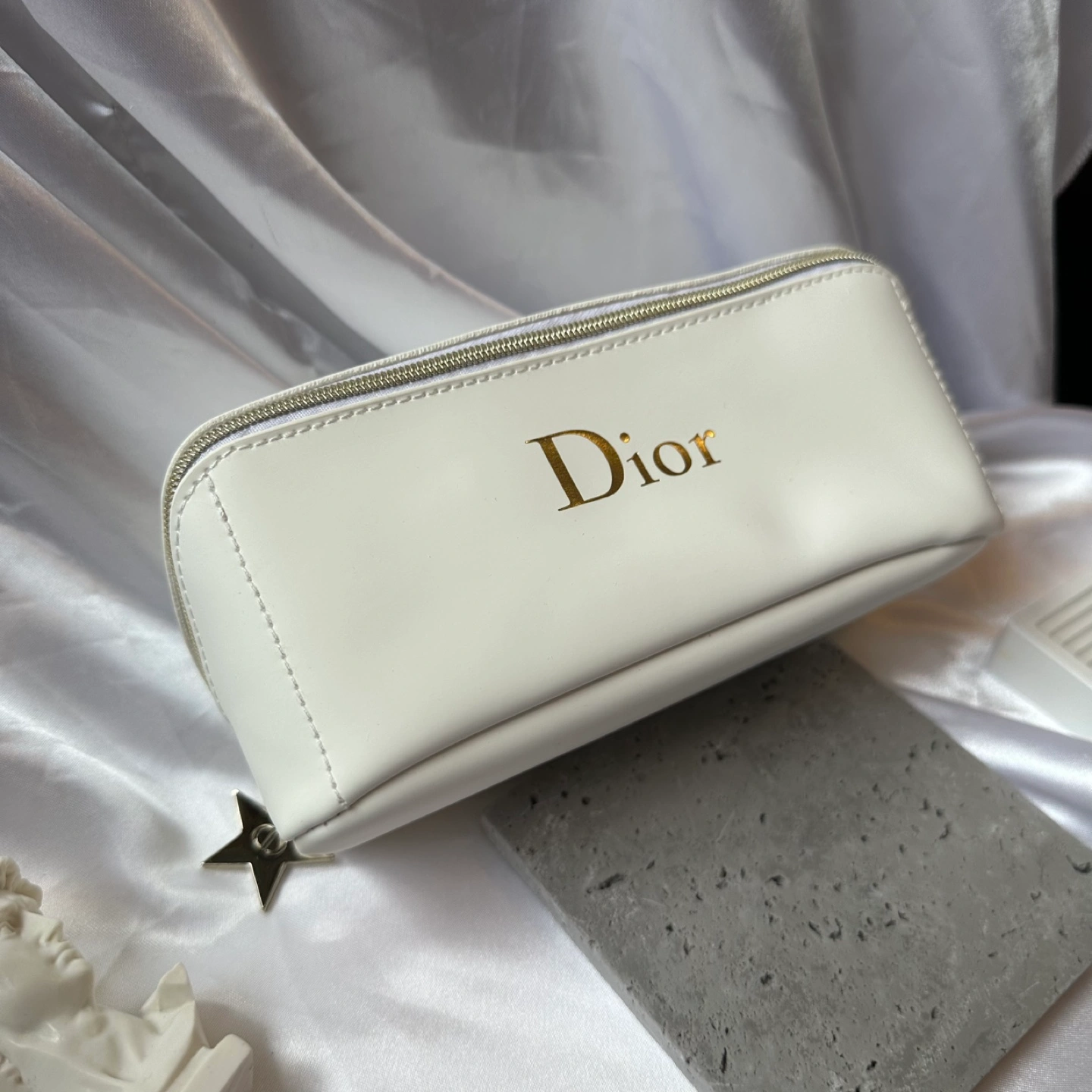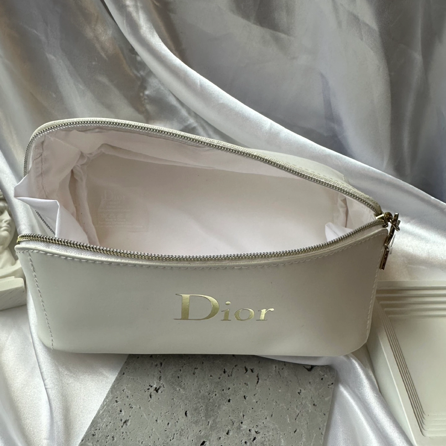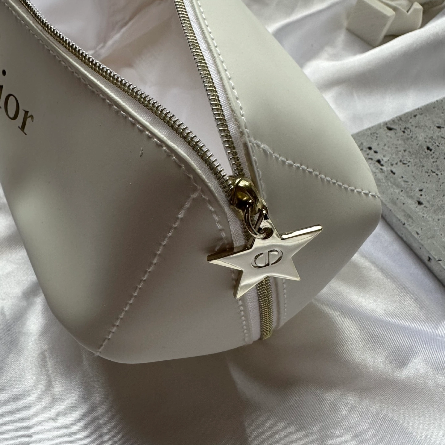 White makeup bag with gold Dior lettering. It has a zipper closure and a star-shaped zipper pull. It has a white interior.