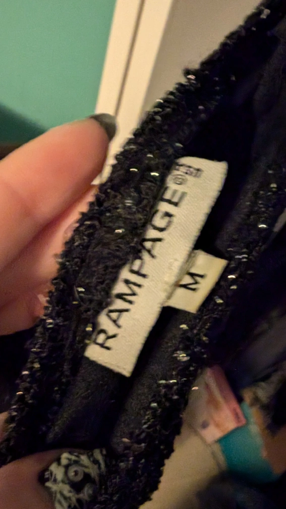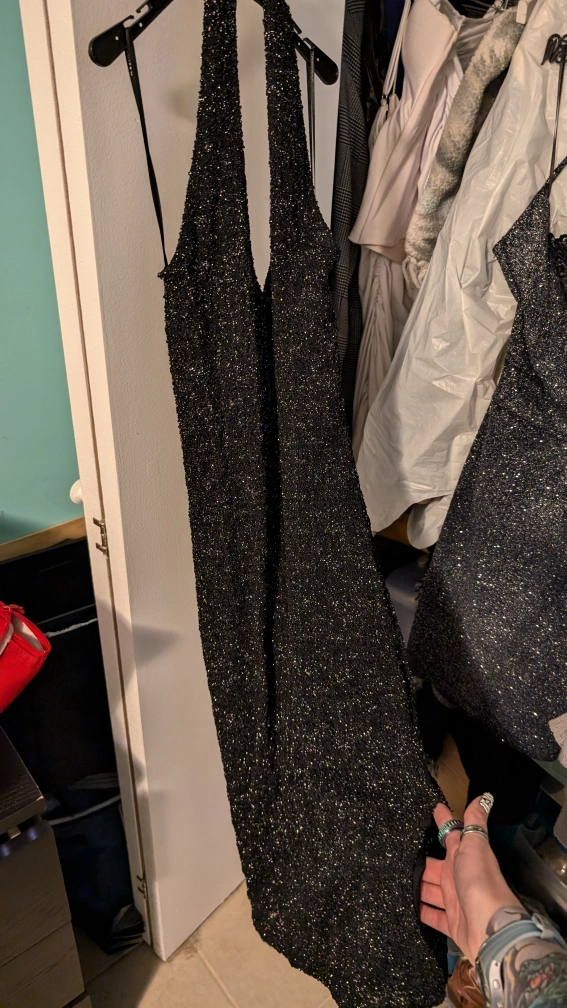 68Black dress with glitter and a fitted silhouette. It is sleeveless and attaches behind the neck. From home with dogs. Chicago 60618