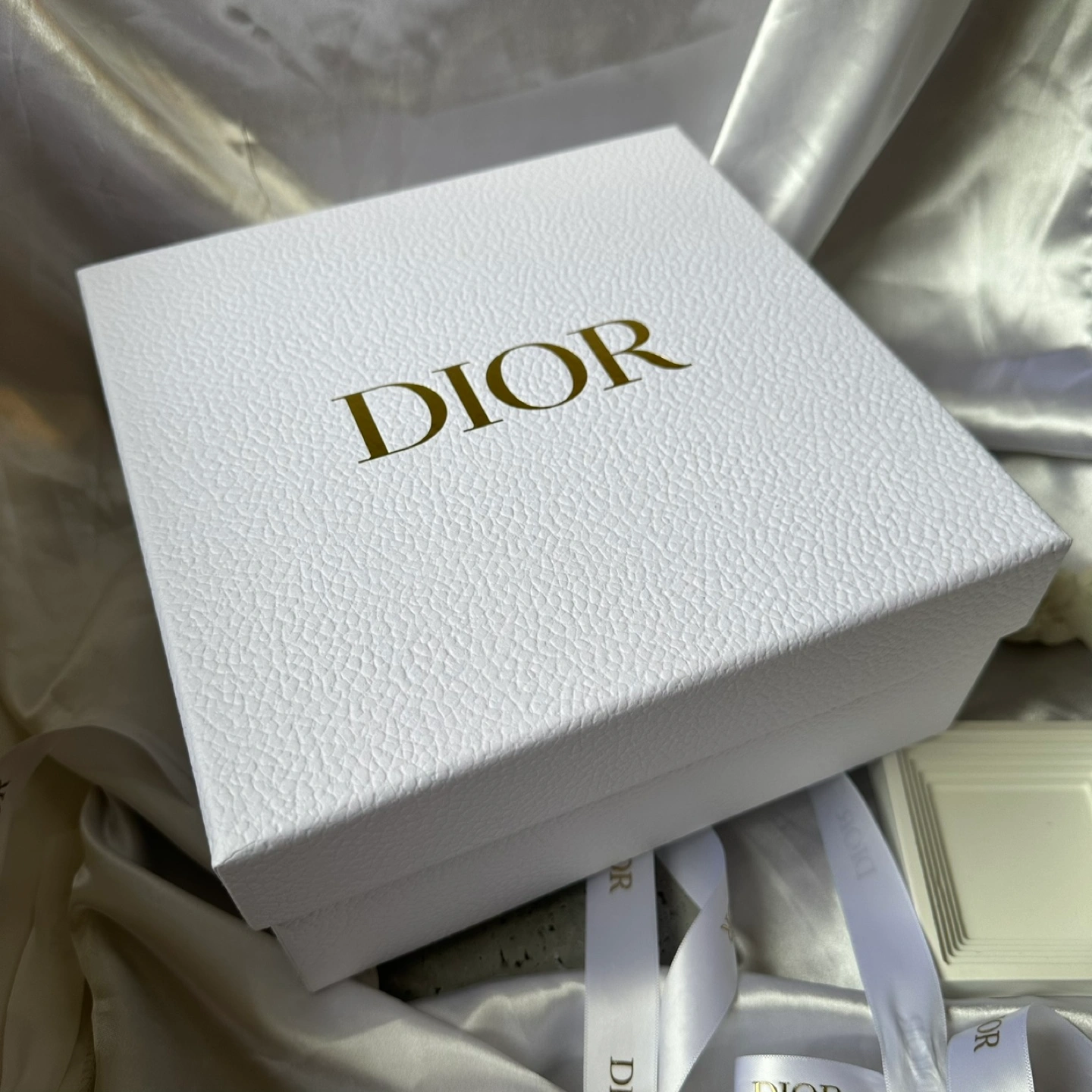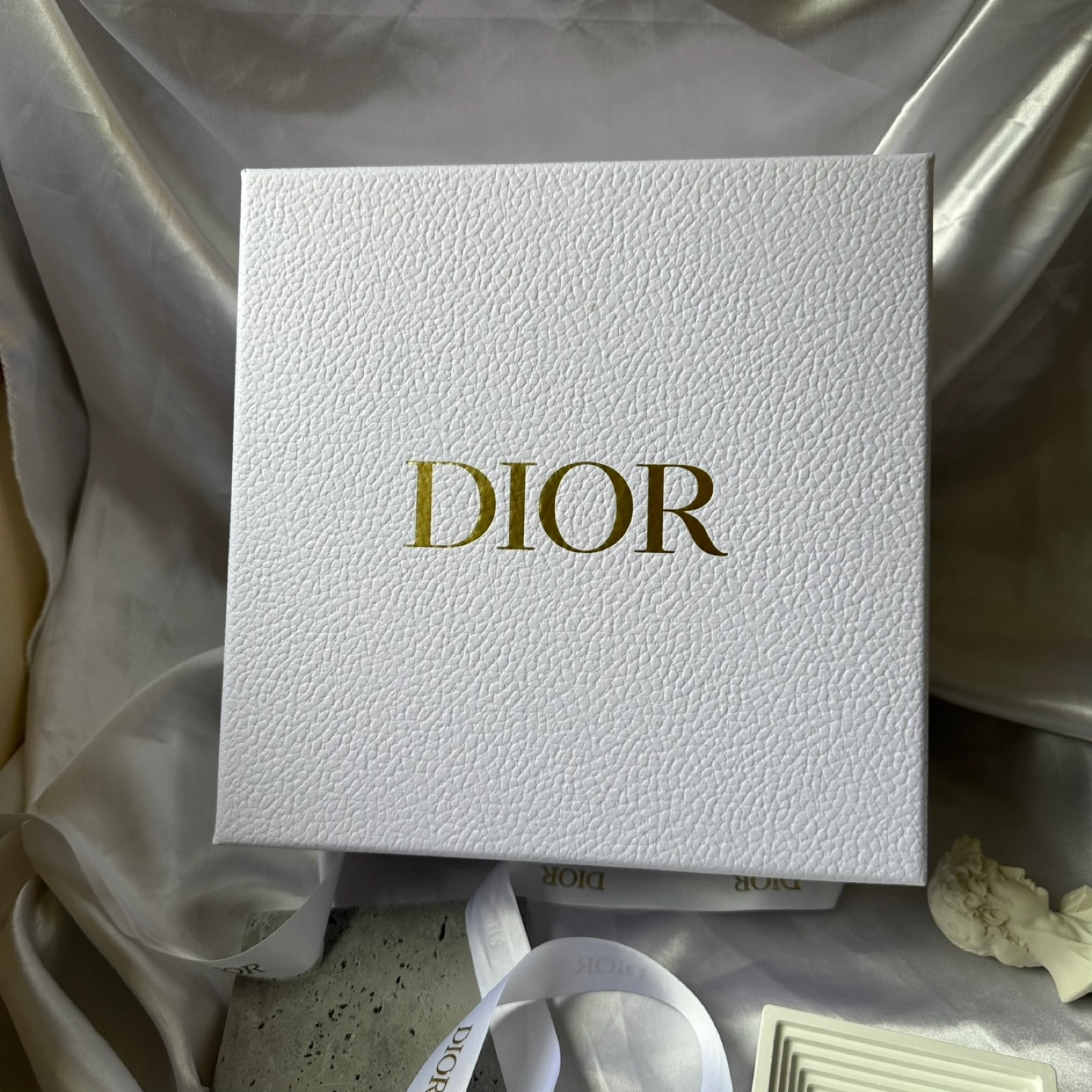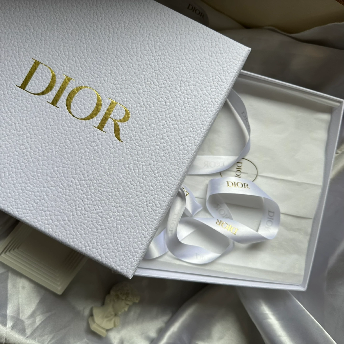 Empty White gift box with gold lettering. Includes tissue paper and ribbon.