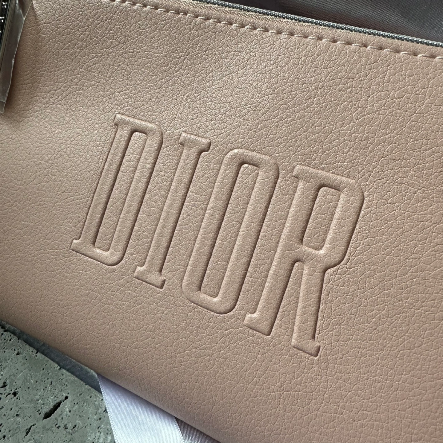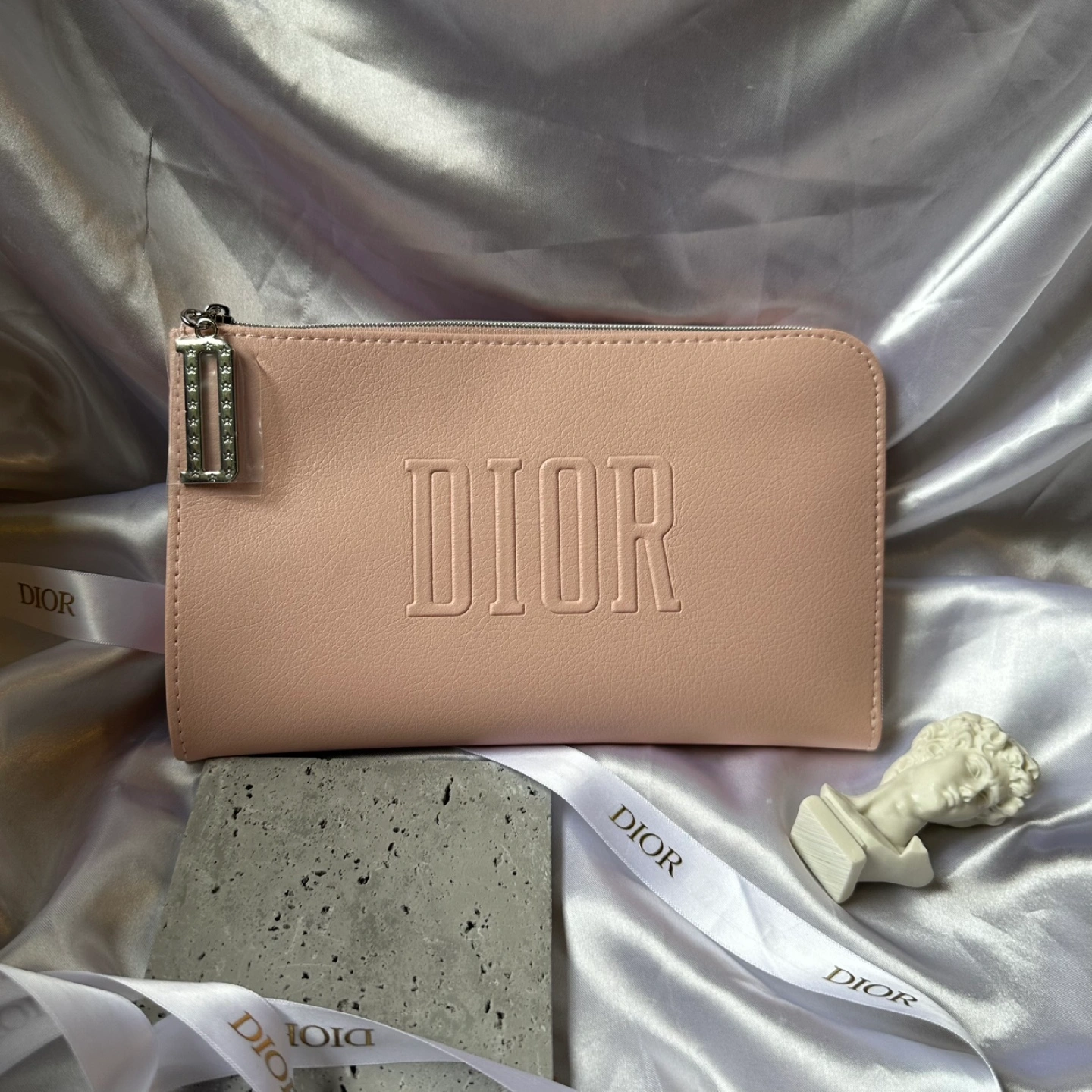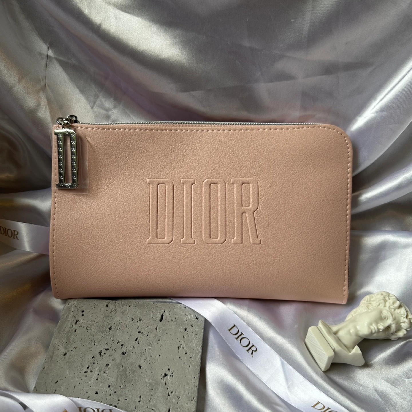 Pink Dior makeup bag with a zipper closure and a silver charm. The bag has the Dior logo embossed on the front.