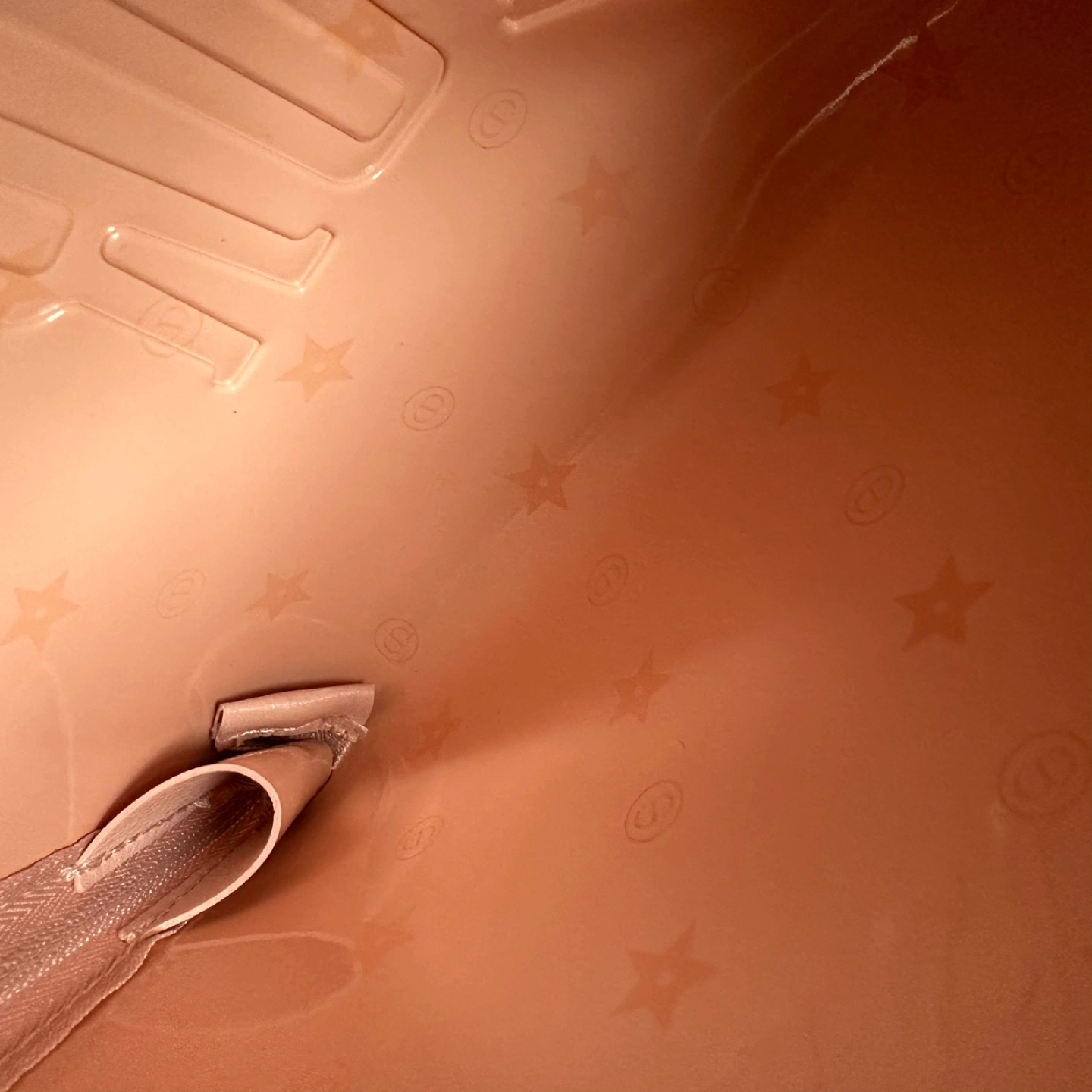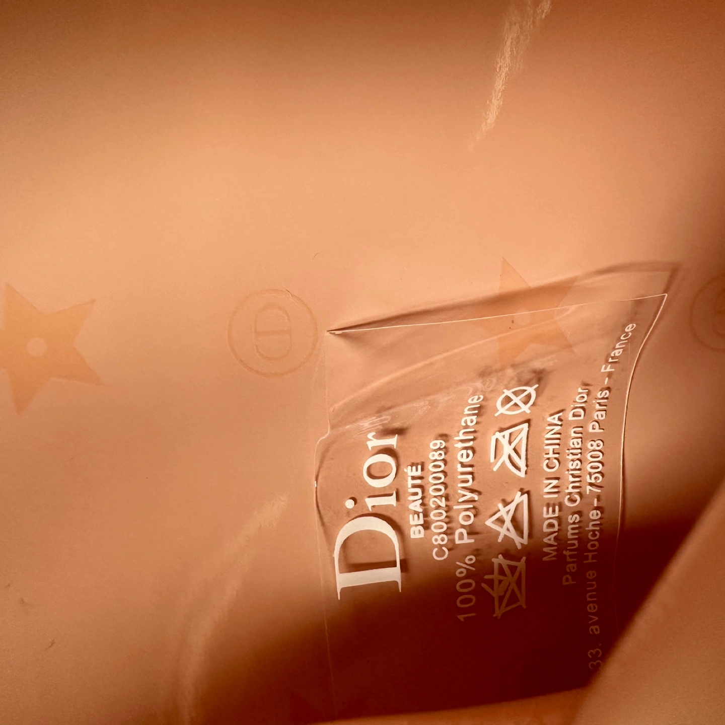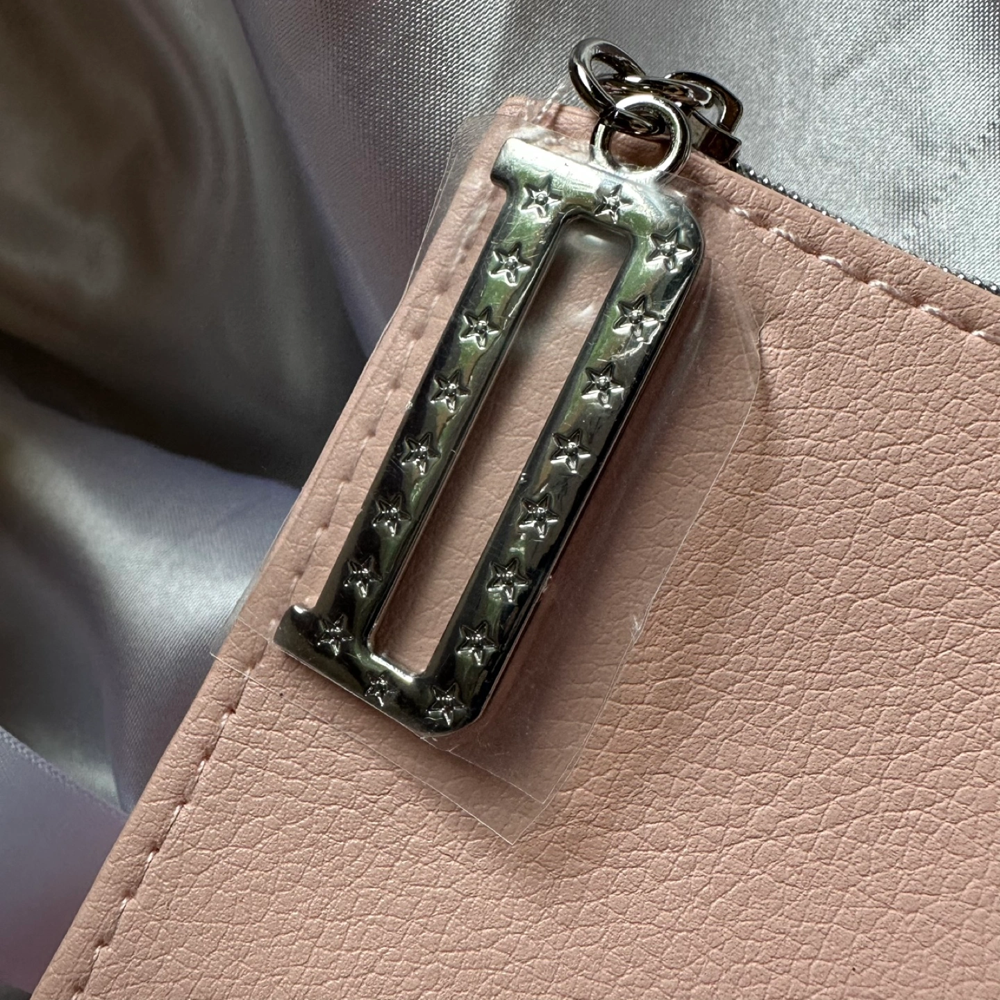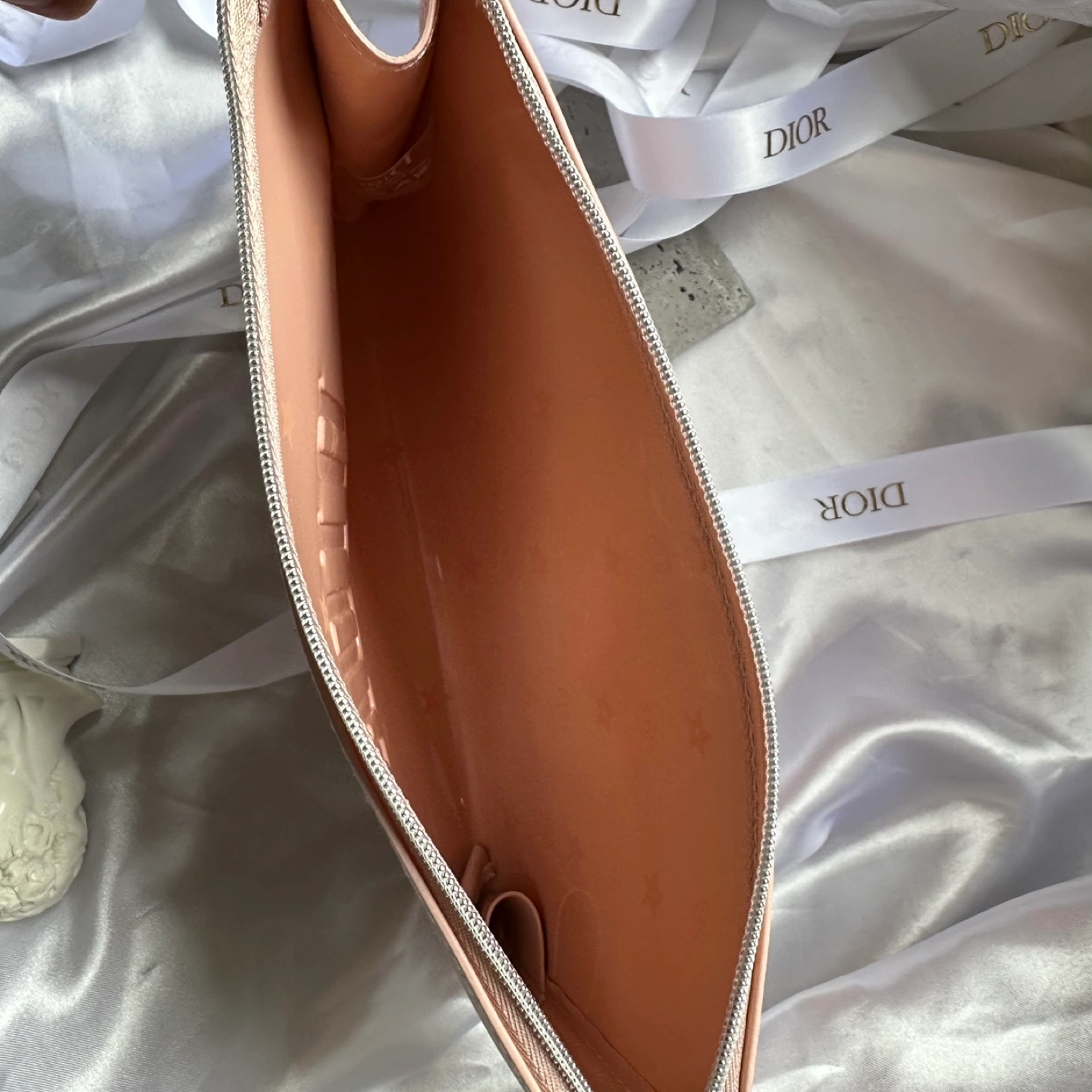 Pink Dior makeup bag with a zipper closure and a silver charm. The bag has the Dior logo embossed on the front.