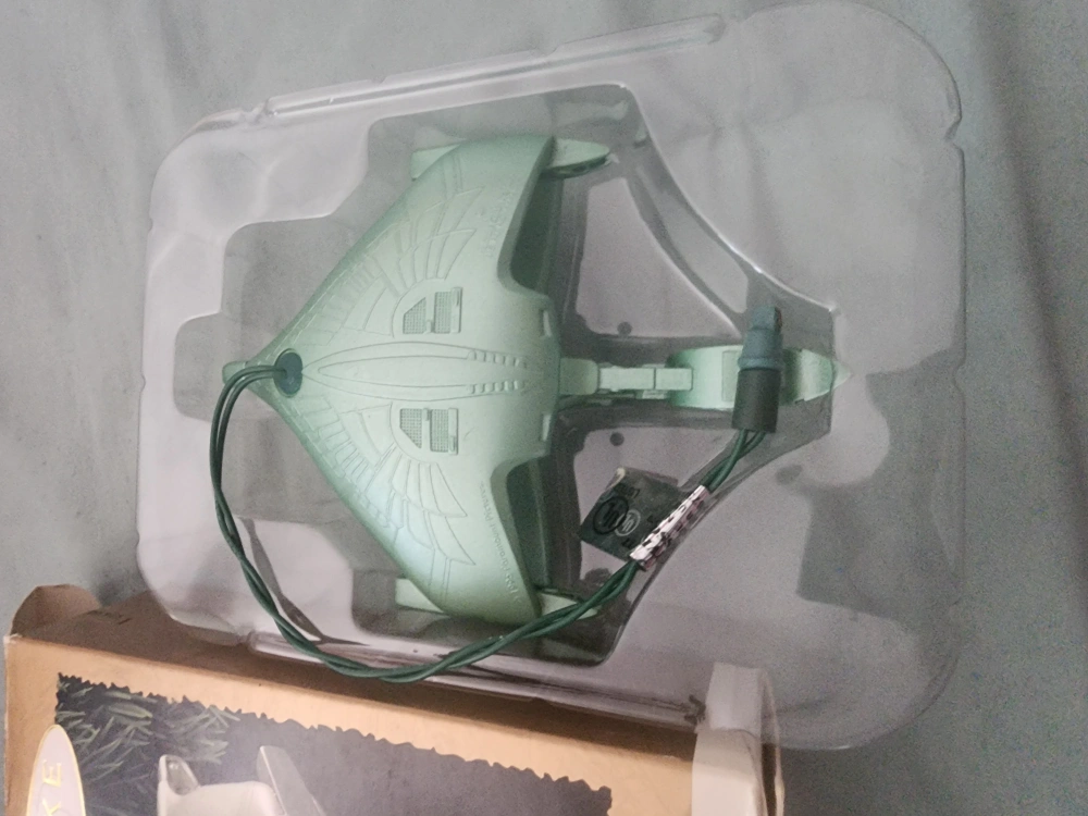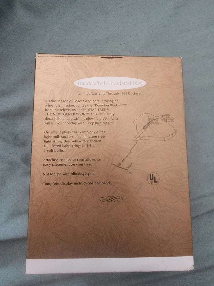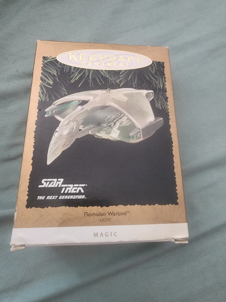 Light-up ornament featuring the Romulan Warbird from Star Trek: The Next Generation. Includes an attached cord with a standard light plug. Includes display instructions. can meet in manhattan for delivery