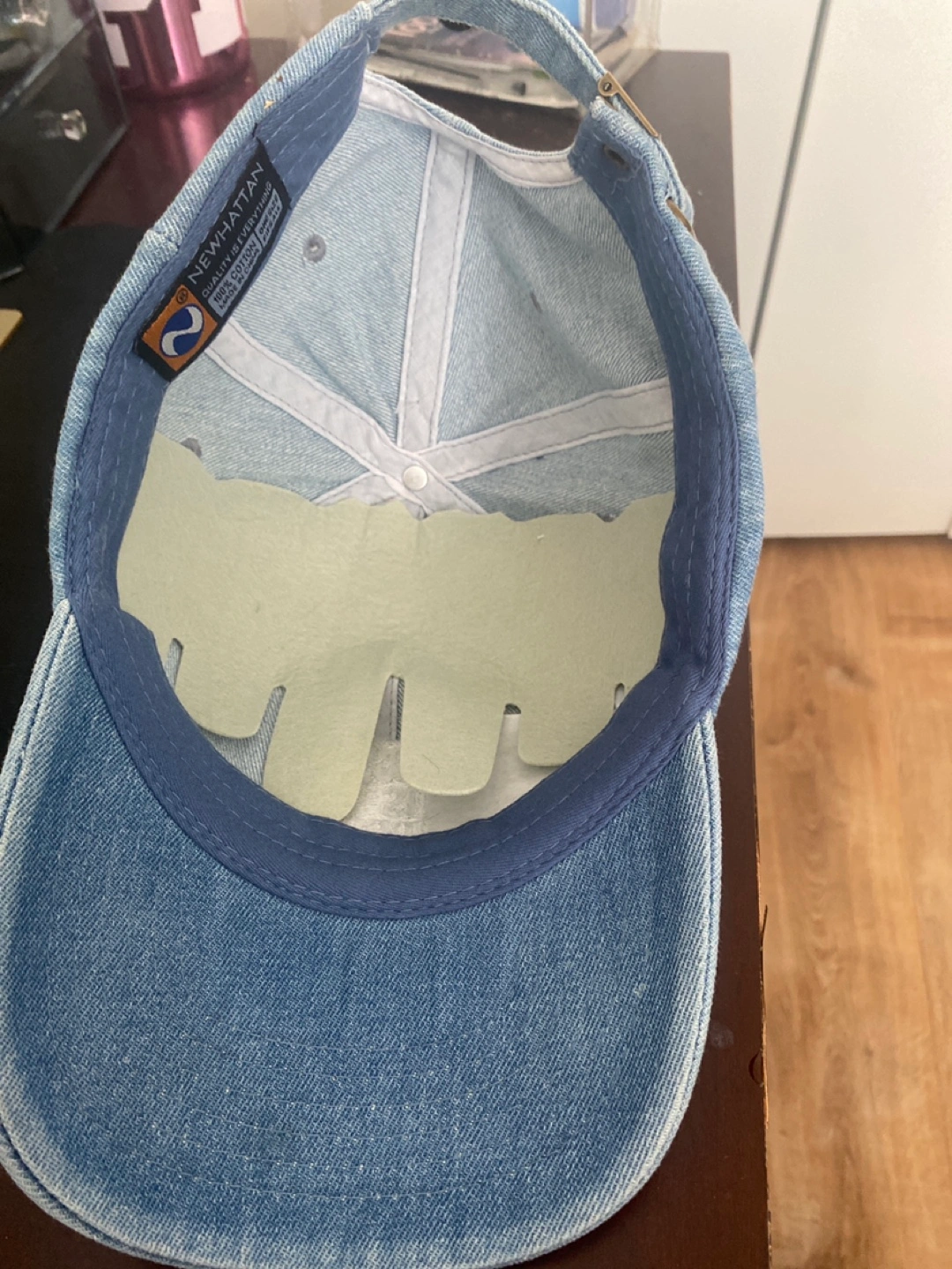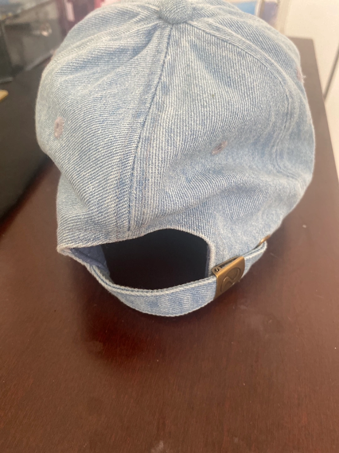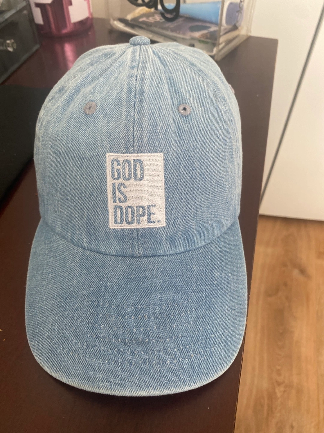 Blue denim baseball cap with an adjustable strap and a God Is Dope patch on the front.