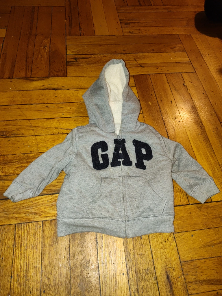 135Gray zip up hoodie with black Gap logo on front. Fleece lined hood.