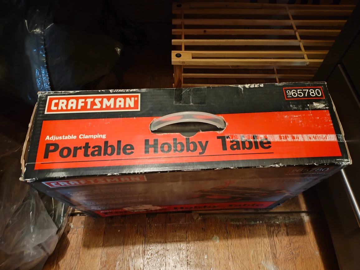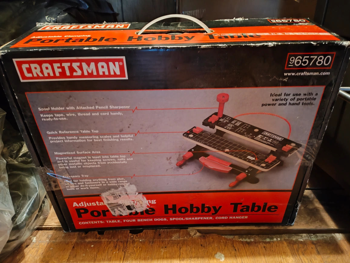 Adjustable clamping. Portable hobby table. Ideal for use with a variety of portable power and hand tools. Includes table, four bench dogs, spool/sharpener, cord hanger.